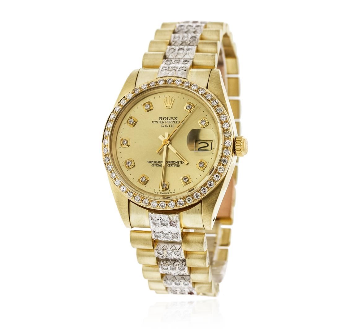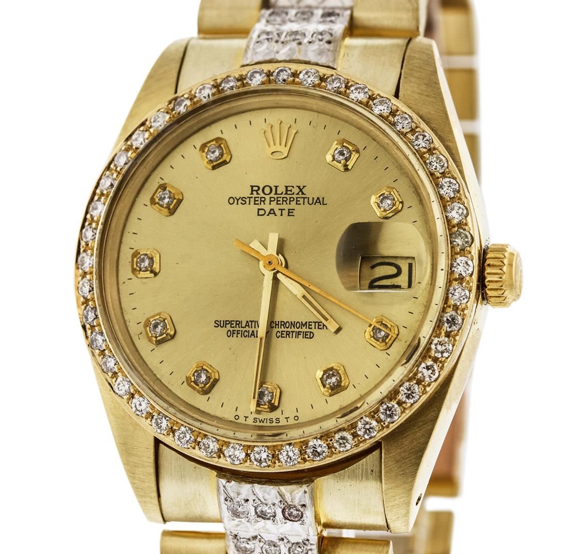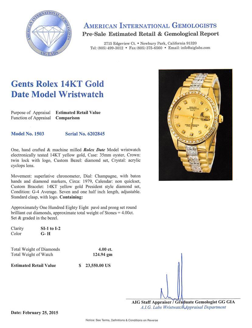 One, hand crafted & machine milled Rolex Date Model wristwatch electronically tested 14KT yellow gold, Case: 35mm oyster, Crown: twin lock with logo, Custom Bezel: diamond set, Crystal: acrylic cyclops lens. Movement: superlative chronometer, Dial: Champagne, with baton hands and diamond markers, Circa: 1979, Calendar: non quickset, Custom Bracelet: 14KT yellow gold President style diamond set, Condition: G-4 Average. Seven and one half inch length, adjustable. Standard clasp, with logo. Containing: Approximately One Hundred Eighty Eight pave and prong set round brilliant cut diamonds, approximate total weight of Stones = 4.00ct. Set & graded in the bezel. Clarity: SI-1 to I-2. Color: G- H. Total Weight of Diamonds 4.00ct. Total Weight of Watch 124.94 grams. AIG Appraised at $23,550.00.