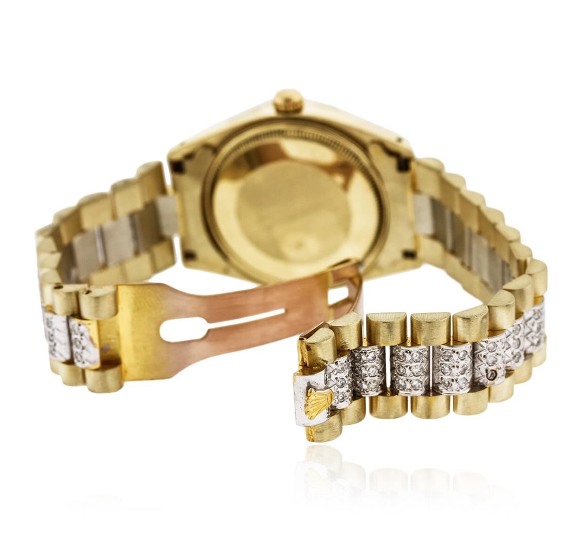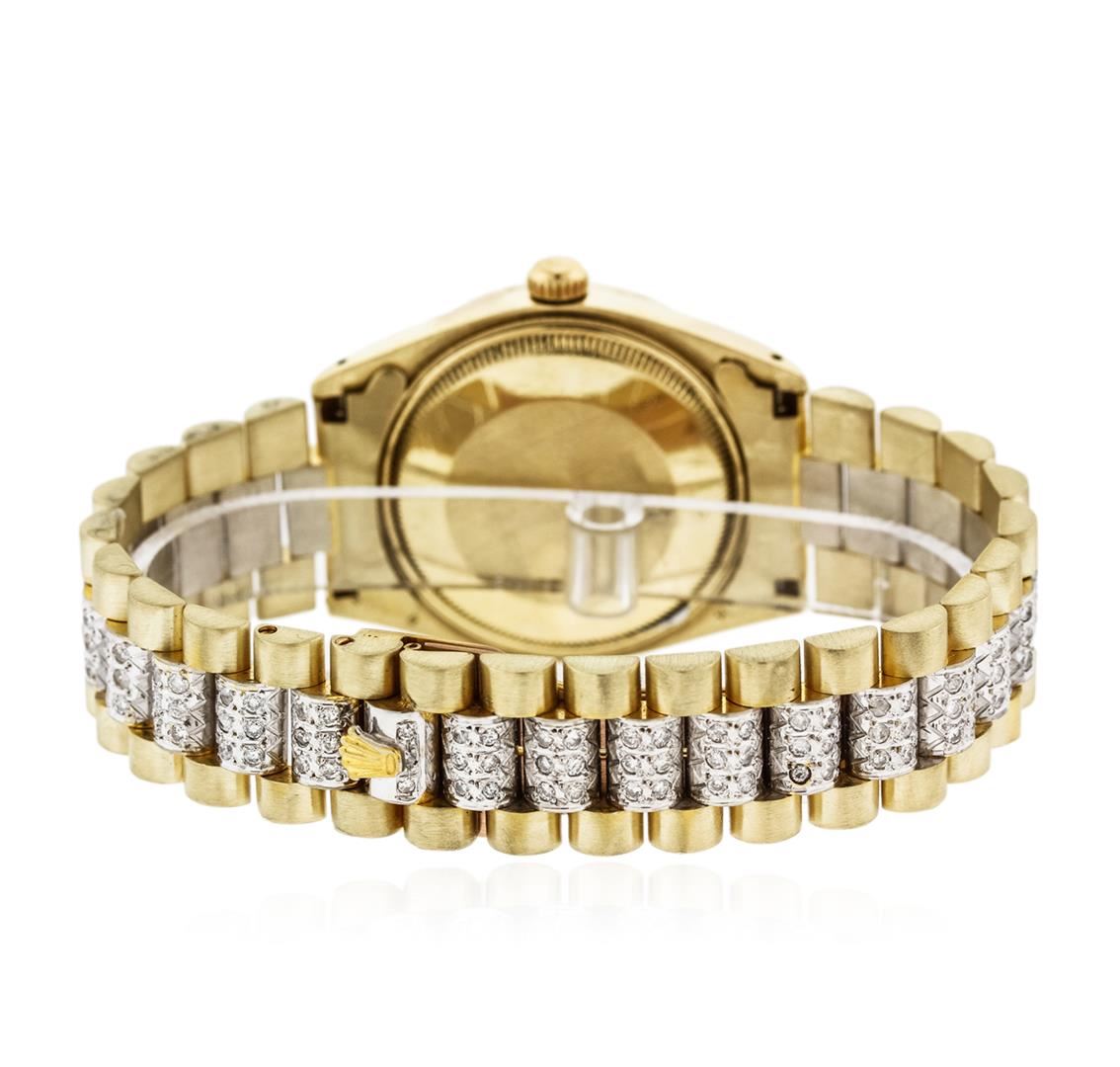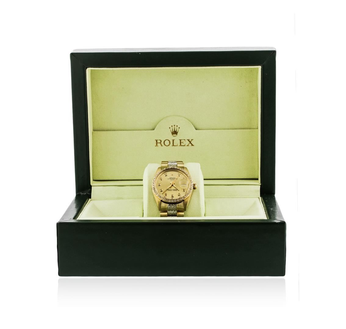 One, hand crafted & machine milled Rolex Date Model wristwatch electronically tested 14KT yellow gold, Case: 35mm oyster, Crown: twin lock with logo, Custom Bezel: diamond set, Crystal: acrylic cyclops lens. Movement: superlative chronometer, Dial: Champagne, with baton hands and diamond markers, Circa: 1979, Calendar: non quickset, Custom Bracelet: 14KT yellow gold President style diamond set, Condition: G-4 Average. Seven and one half inch length, adjustable. Standard clasp, with logo. Containing: Approximately One Hundred Eighty Eight pave and prong set round brilliant cut diamonds, approximate total weight of Stones = 4.00ct. Set & graded in the bezel. Clarity: SI-1 to I-2. Color: G- H. Total Weight of Diamonds 4.00ct. Total Weight of Watch 124.94 grams. AIG Appraised at $23,550.00.