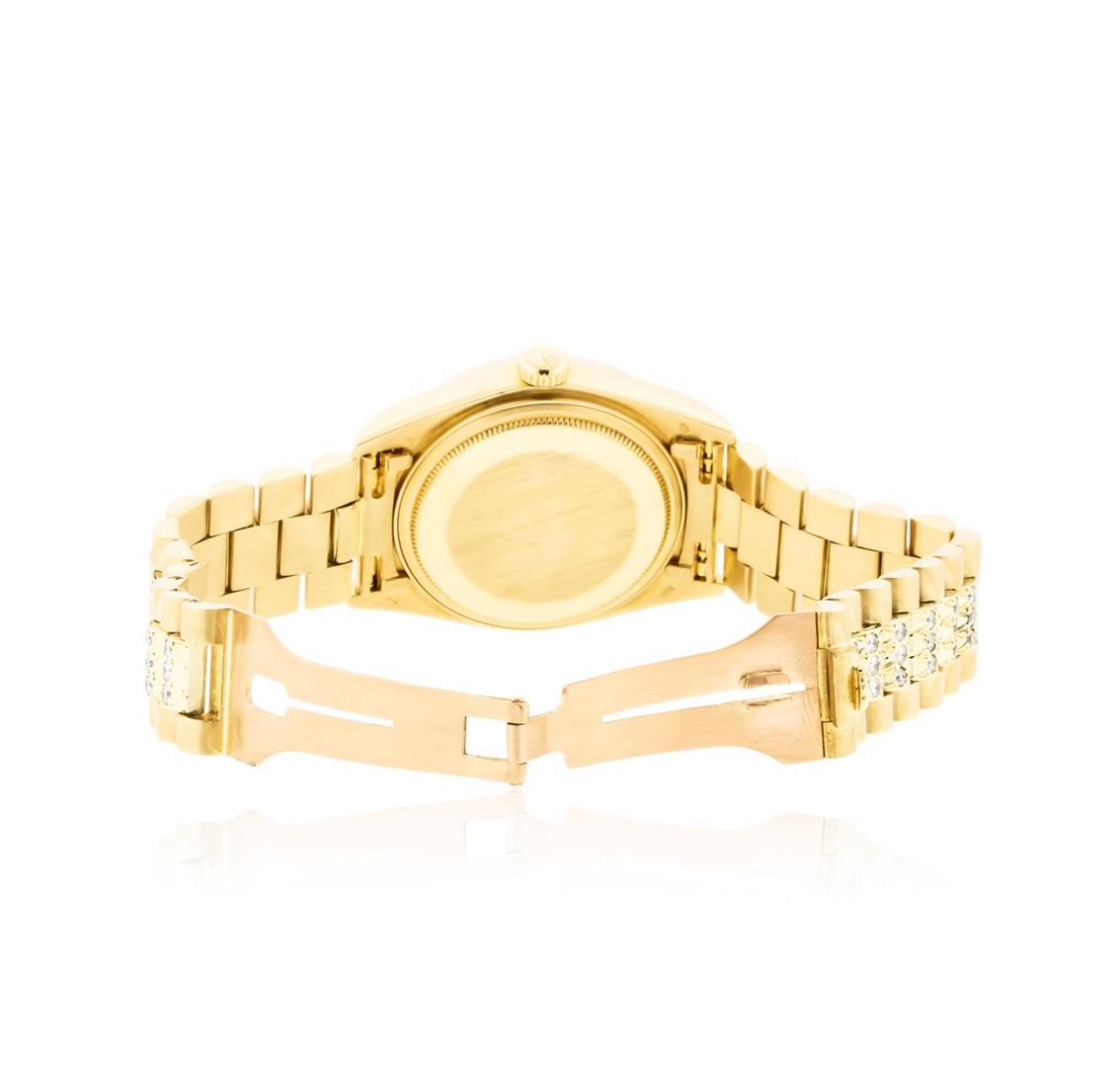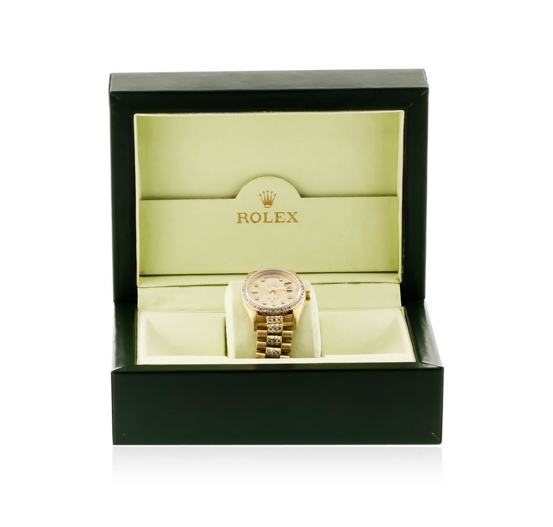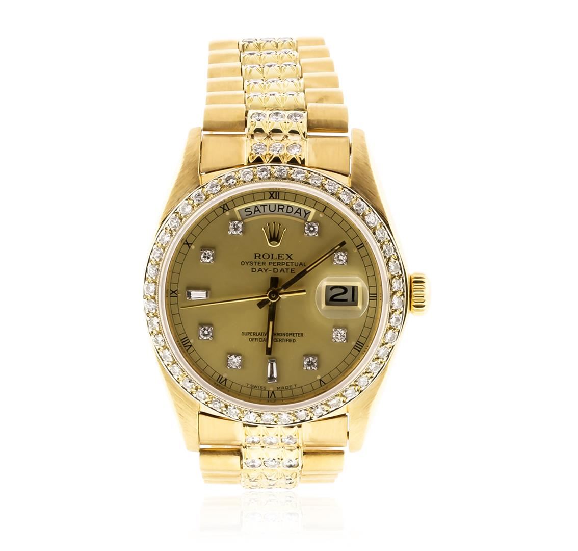 One gents, hand crafted & machine milled Rolex DayDate Model wristwatch Super President style, electronically tested 18KT yellow gold, Case: 36mm oyster, Crown: twin lock with logo, Custom Bezel: diamond set, Custom Crystal: synthetic sapphire cyclops lens, Movement: superlative chronometer, Circa: 1979.Custom Dial: Champagne color, baton hands and diamond markers, Calendar: 3 o'clock position, single-quick set, Customized Bracelet: 18KT yellow gold pave‚ diamond set center link, Super President style, Condition: G-4 Average. Bright polish & brushed finish. Seven and one half inch length. Three removable links. Concealed deployment clasp, with logo. Containing: Approximately One Hundred Eighteen pave‚ & prong set round brilliant cut diamonds, approximate total weight equals 4.40ct. Set & graded in the bezel, and the bracelet. Clarity SI-1 to I-1. Color: G - I. Total Weight of Diamonds 4.40ct. Total Weight of Watch 135.23gm. AIG Appraised at $28,550.00.