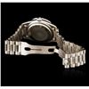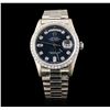 One gents, hand crafted & machine milled Rolex DayDate Model wristwatch electronically tested 18KT white gold, Case: 36mm oyster, Crown: twin lock with logo, Custom Bezel: diamond set, Custom Crystal: synthetic sapphire cyclops lens, Circa 1998. Movement: superlative chronometer, Custom Dial: Royal Blue color, with baton hands, & diamond markers, Calendar: double quick set, Bracelet: 18KT white gold, bright polish & brushed finish, Condition: G-4 Average. Seven and three quarter inch length. Concealed deployment clasp, with logo Containing: Forty Four prong set round brilliant cut diamonds, approximate total weight equals 1.32ct. Set & graded in the bezel. Clarity: VS-1 to SI-1. Color: G - H. Total Weight of Diamonds 1.32ct. Total Weight of Watch 138.90 grams. AIG Appraised at $26,000.00.