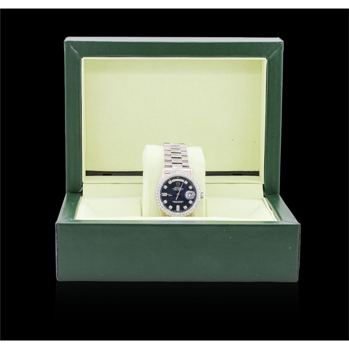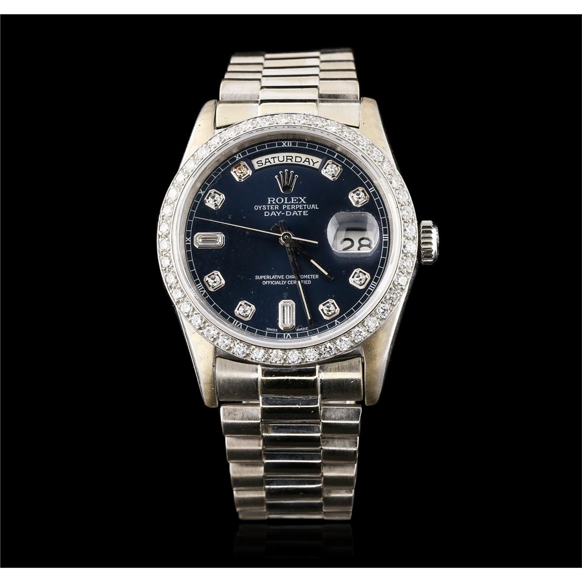 One gents, hand crafted & machine milled Rolex DayDate Model wristwatch electronically tested 18KT white gold, Case: 36mm oyster, Crown: twin lock with logo, Custom Bezel: diamond set, Custom Crystal: synthetic sapphire cyclops lens, Circa 1998. Movement: superlative chronometer, Custom Dial: Royal Blue color, with baton hands, & diamond markers, Calendar: double quick set, Bracelet: 18KT white gold, bright polish & brushed finish, Condition: G-4 Average. Seven and three quarter inch length. Concealed deployment clasp, with logo Containing: Forty Four prong set round brilliant cut diamonds, approximate total weight equals 1.32ct. Set & graded in the bezel. Clarity: VS-1 to SI-1. Color: G - H. Total Weight of Diamonds 1.32ct. Total Weight of Watch 138.90 grams. AIG Appraised at $26,000.00.