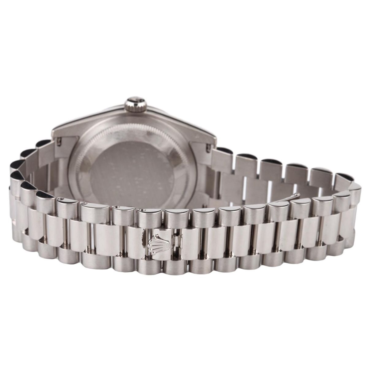 One gents 18KT white gold Rolex Presidential Day Date wristwatch. Model Name/Number: Day-Date (President) 118239. The watch features automatic movement with day-date, double quickset, scratch-resistant sapphire crystal, waterproof screw-down crown. Case: 18k white gold (36mm) with fluted bezel. Dial: Rolex Havana Roman. Bracelet: 18k white gold President with hidden clasp.