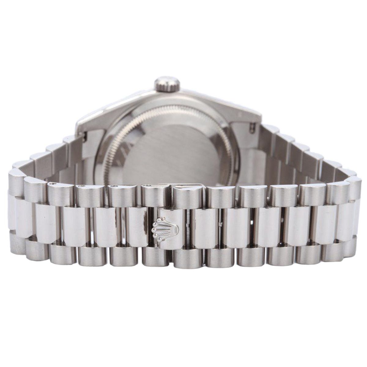 One gents 18KT white gold Rolex Presidential Day Date wristwatch. Model Name/Number: Day-Date 118209. The watch features automatic double quickset movement with day-date, scratch resistant sapphire crystal, waterproof screw-down crown. Case: 18k white gold (36mm) with smooth bezel. Dial: Slate Roman. Bracelet: 18k white gold Oyster with hidden clasp.