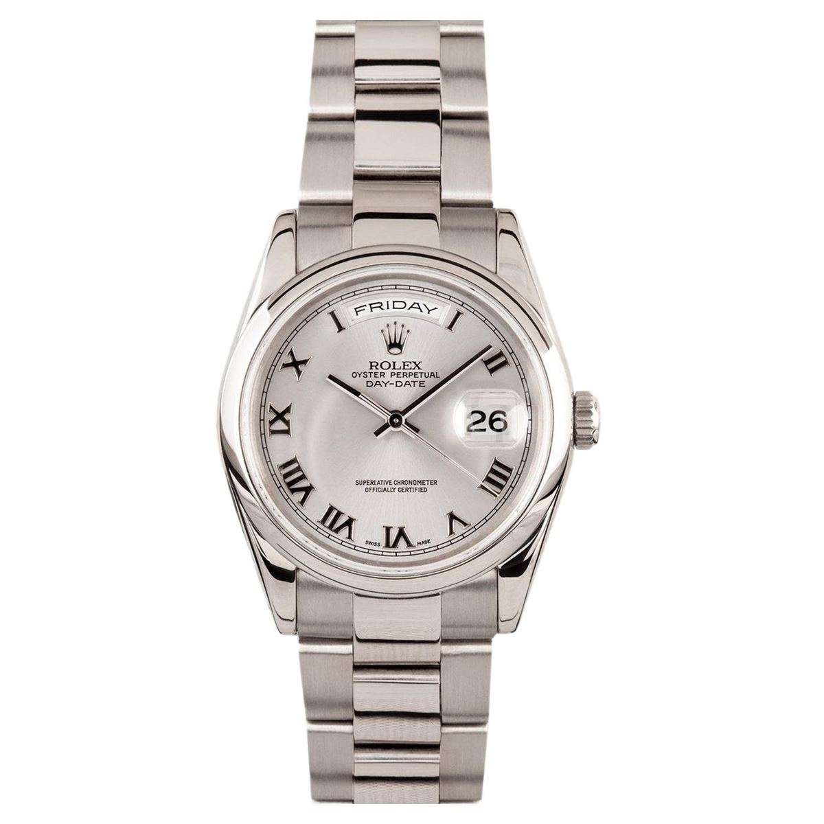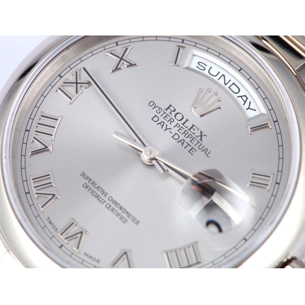 One gents 18KT white gold Rolex Presidential Day Date wristwatch. Model Name/Number: Day-Date 118209. The watch features automatic double quickset movement with day-date, scratch resistant sapphire crystal, waterproof screw-down crown. Case: 18k white gold (36mm) with smooth bezel. Dial: Slate Roman. Bracelet: 18k white gold Oyster with hidden clasp.
