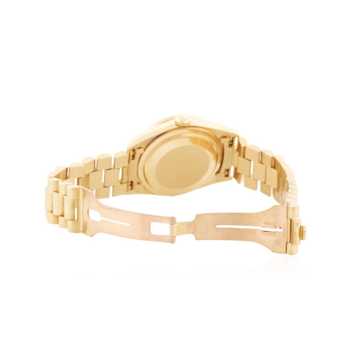 One gents, hand crafted & machine milled Rolex DayDate Model The President wristwatch electronically tested 18KT yellow gold, Case: 36mm oyster, Crown: twin lock with logo, Bezel: diamond set, Crystal: synthetic sapphire cyclops lens. Circa: 1990.Movement: superlative chronometer, Dial: Light Champagne color, baton hands & raised Roman numerals, Calendar: double quick set, Bracelet: 18KT yellow gold, bright & satin finish, Condition: G-5 Fine. Seven inch length. Concealed deployment clasp, with logo. Containing: Forty Five prong set round brilliant cut diamonds, approximate total weight equals 1.20ct. Clarity VVS-2. Color: F -H. Total Weight of Diamonds 1.20ct. Total Weight of Watch 133.87 grams. AIG Appraised at $28,050.00.
