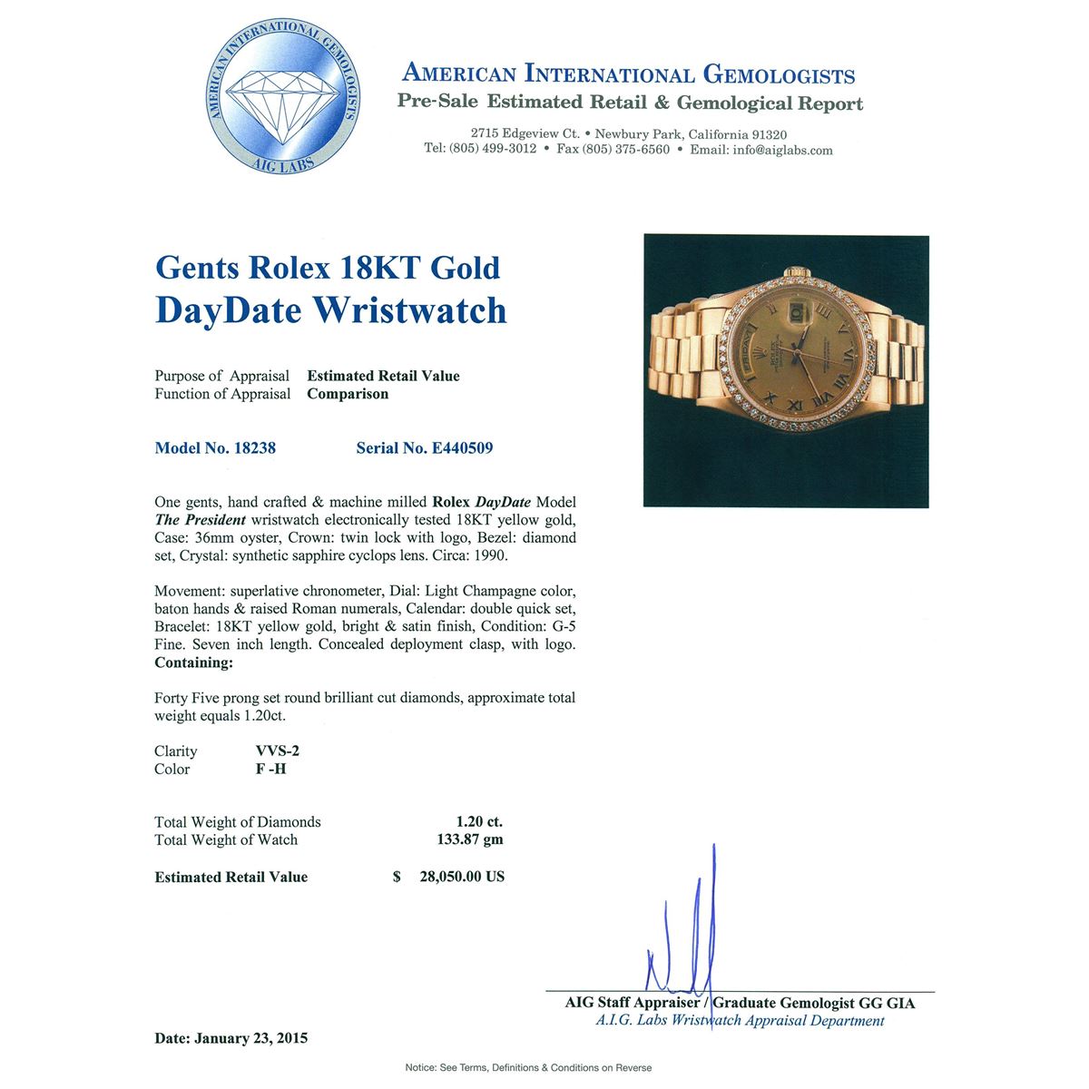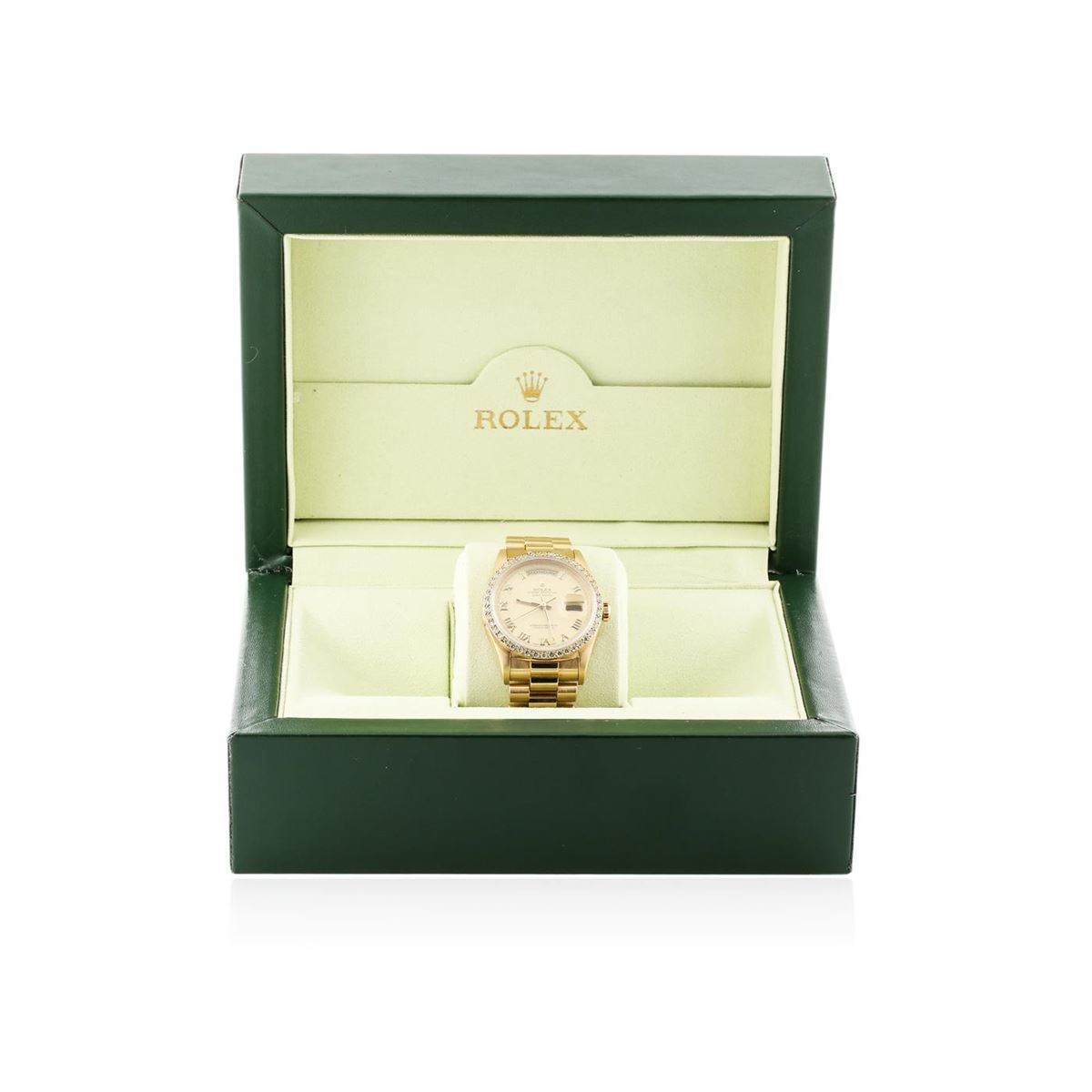 One gents, hand crafted & machine milled Rolex DayDate Model The President wristwatch electronically tested 18KT yellow gold, Case: 36mm oyster, Crown: twin lock with logo, Bezel: diamond set, Crystal: synthetic sapphire cyclops lens. Circa: 1990.Movement: superlative chronometer, Dial: Light Champagne color, baton hands & raised Roman numerals, Calendar: double quick set, Bracelet: 18KT yellow gold, bright & satin finish, Condition: G-5 Fine. Seven inch length. Concealed deployment clasp, with logo. Containing: Forty Five prong set round brilliant cut diamonds, approximate total weight equals 1.20ct. Clarity VVS-2. Color: F -H. Total Weight of Diamonds 1.20ct. Total Weight of Watch 133.87 grams. AIG Appraised at $28,050.00.