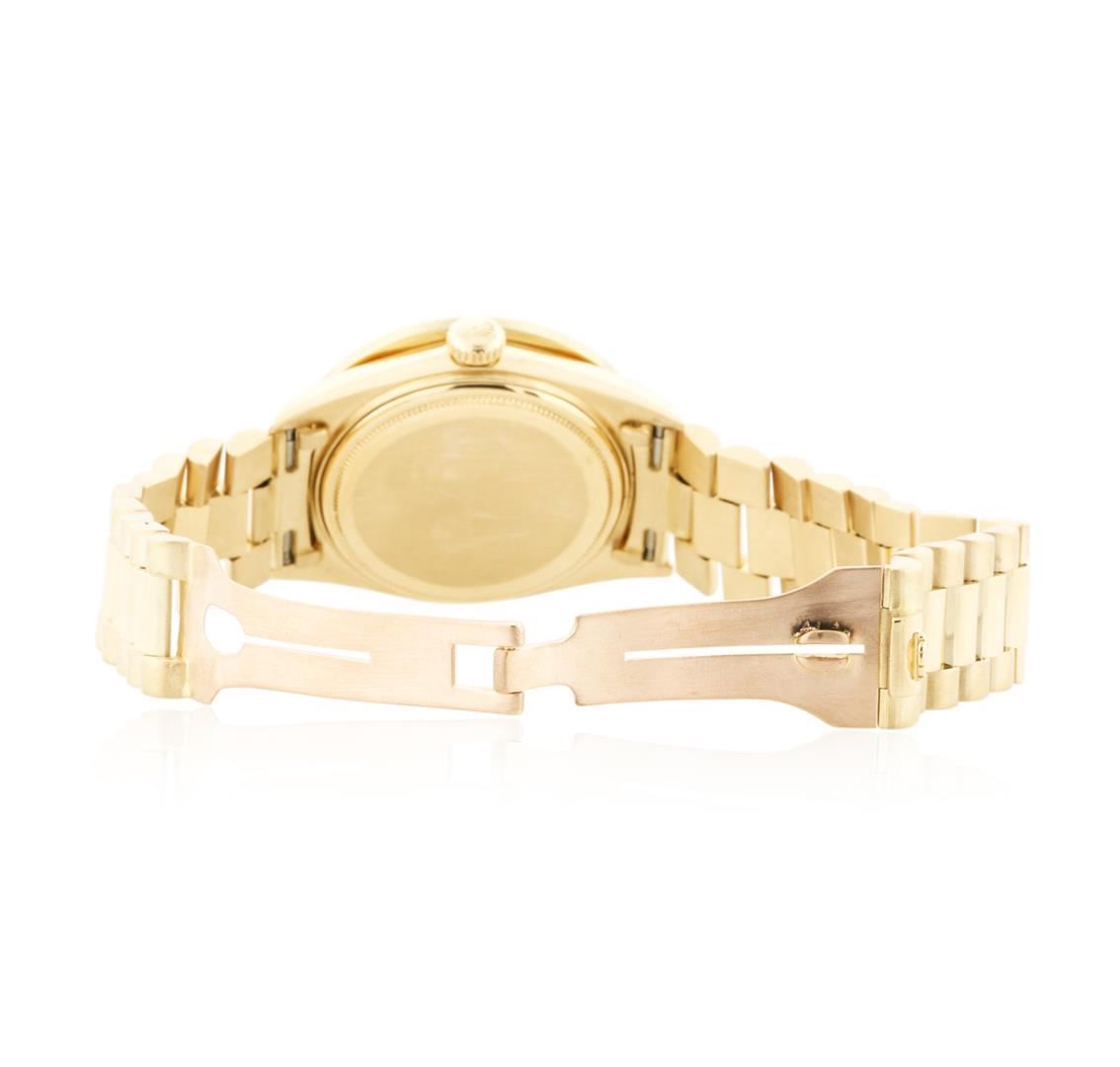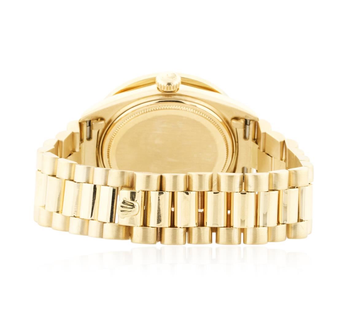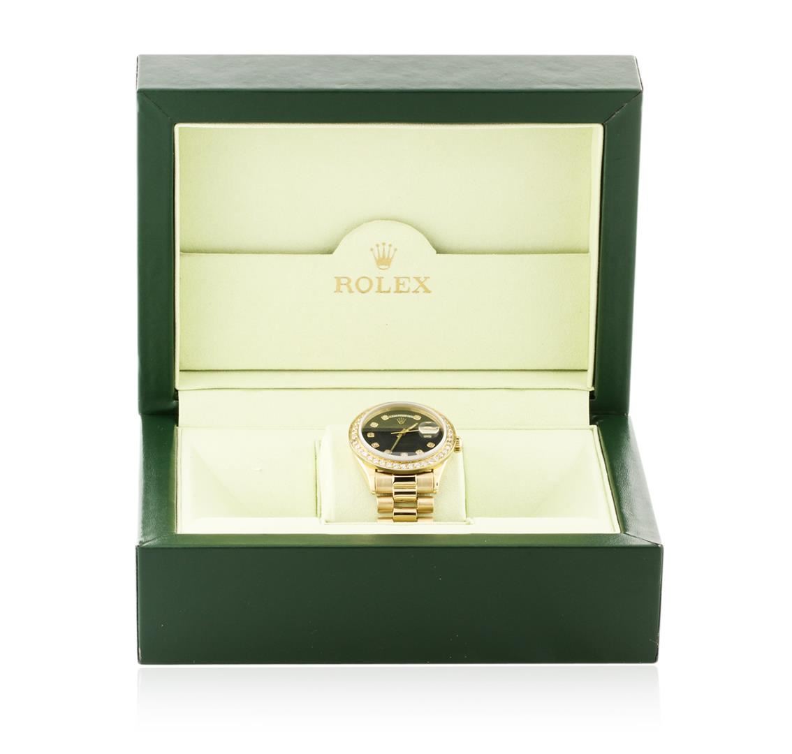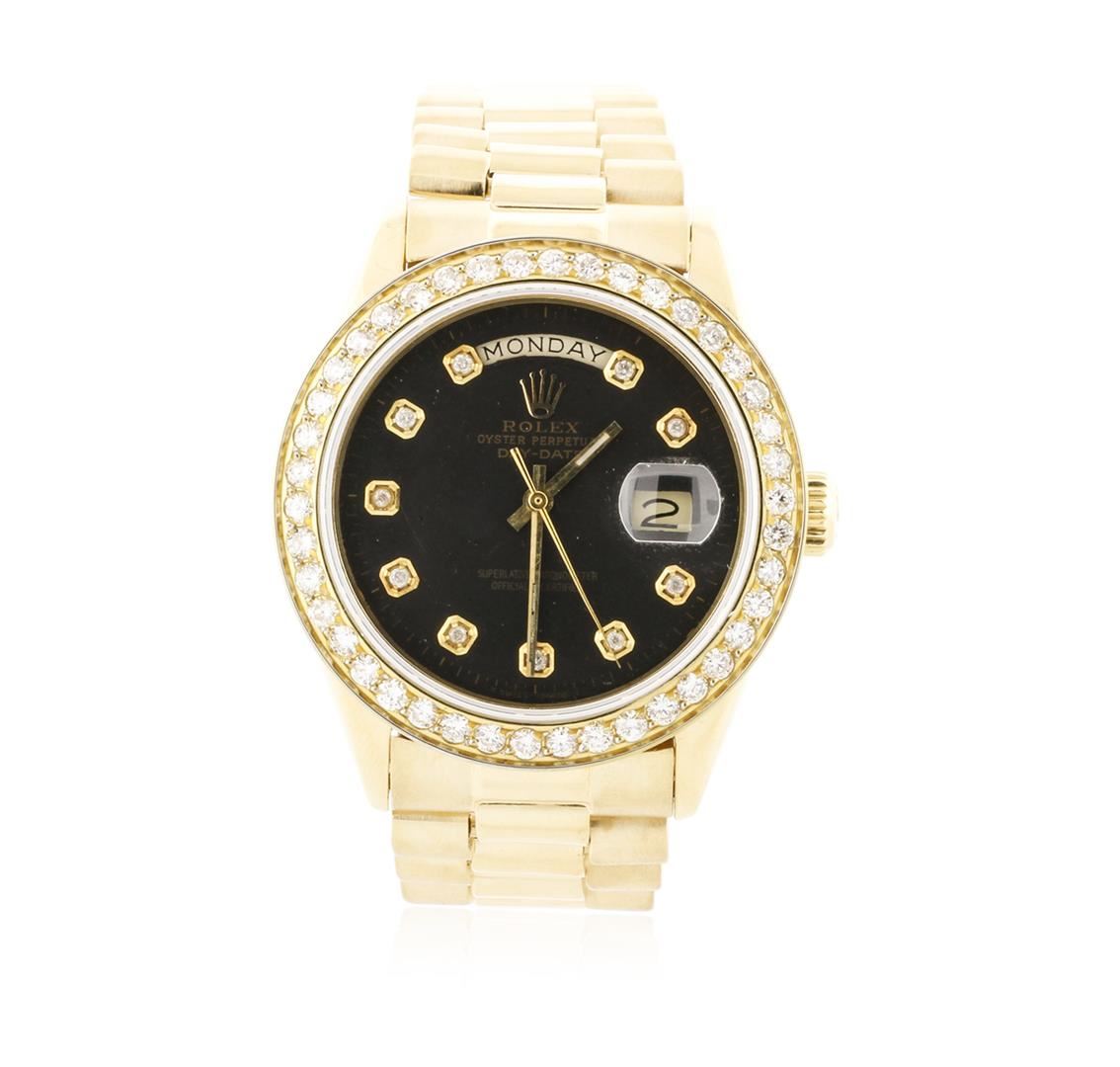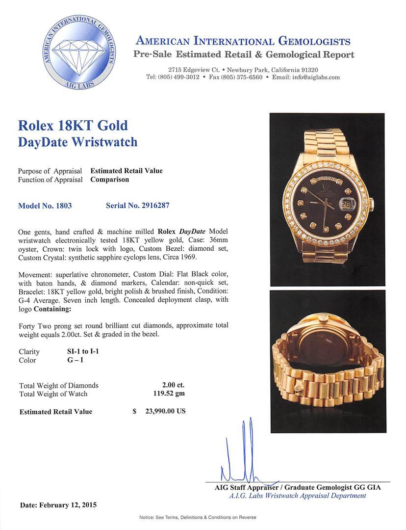 One gents, hand crafted & machine milled Rolex DayDate Model wristwatch electronically tested 18KT yellow gold, Case: 36mm oyster, Crown: twin lock with logo, Custom Bezel: diamond set, Custom Crystal: synthetic sapphire cyclops lens, Circa 1969. Movement: superlative chronometer, Custom Dial: Flat Black color, with baton hands, & diamond markers, Calendar: non-quick set, Bracelet: 18KT yellow gold, bright polish & brushed finish, Condition: G-4 Average. Seven inch length. Concealed deployment clasp, with logo Containing: Forty Two prong set round brilliant cut diamonds, approximate total weight equals 2.00ct. Set & graded in the bezel. Clarity: SI-1 to I-1. Color: G - I. Total Weight of Diamonds 2.00ct. Total Weight of Watch 119.52 grams. AIG Appraised at $23,990.00.