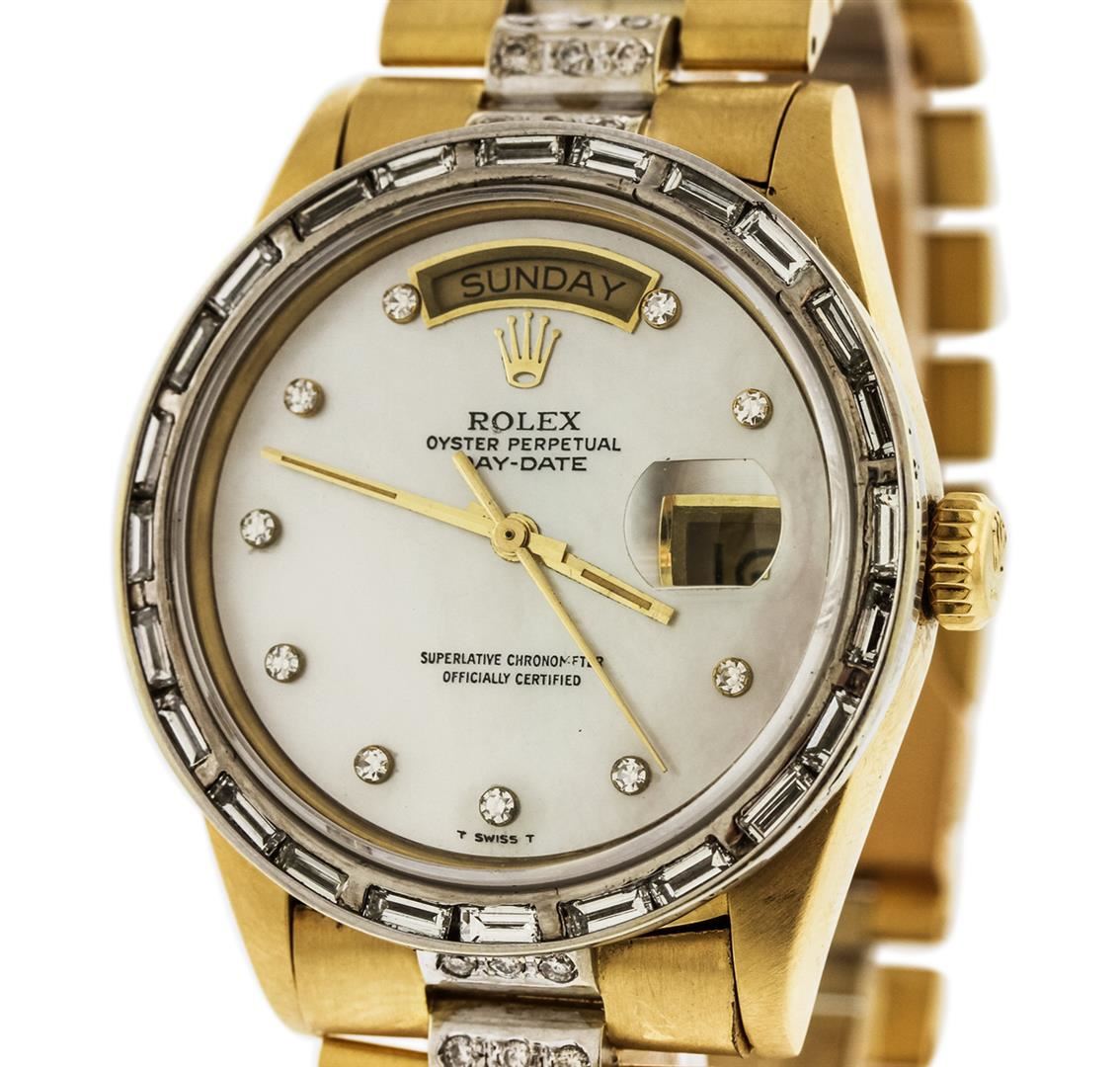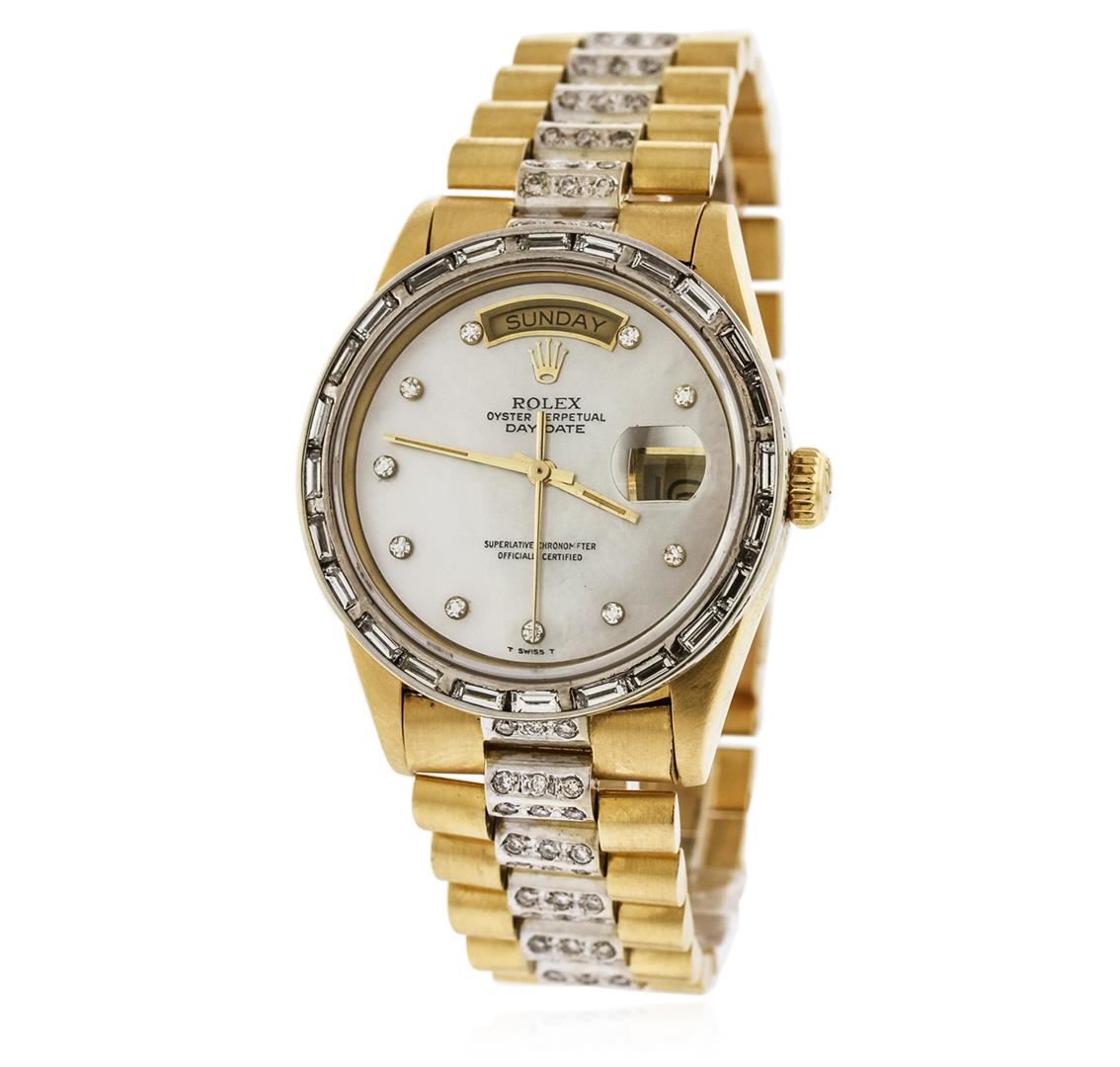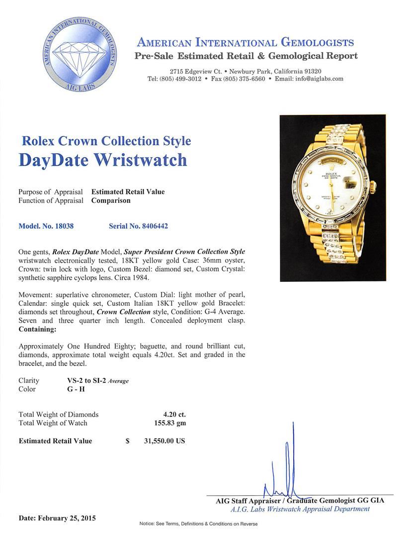 One gents, Rolex DayDate Model, Super President Crown Collection Style wristwatch electronically tested, 18KT yellow gold Case: 36mm oyster, Crown: twin lock with logo, Custom Bezel: diamond set, Custom Crystal: synthetic sapphire cyclops lens. Circa 1984.Movement: superlative chronometer, Custom Dial: light mother of pearl, Calendar: single quick set, Custom Italian 18KT yellow gold Bracelet: diamonds set throughout, Crown Collection style, Condition: G-4 Average. Seven and three quarter inch length. Concealed deployment clasp. Containing: Approximately One Hundred Eighty; baguette, and round brilliant cut, diamonds, approximate total weight equals 4.20ct. Set and graded in the bracelet, and the bezel. Clarity: VS-2 to SI-2 Average. Color: G - H. Total Weight of Diamonds 4.20ct. Total Weight of Watch 155.83 grams. AIG Appraised at $31,550.00.