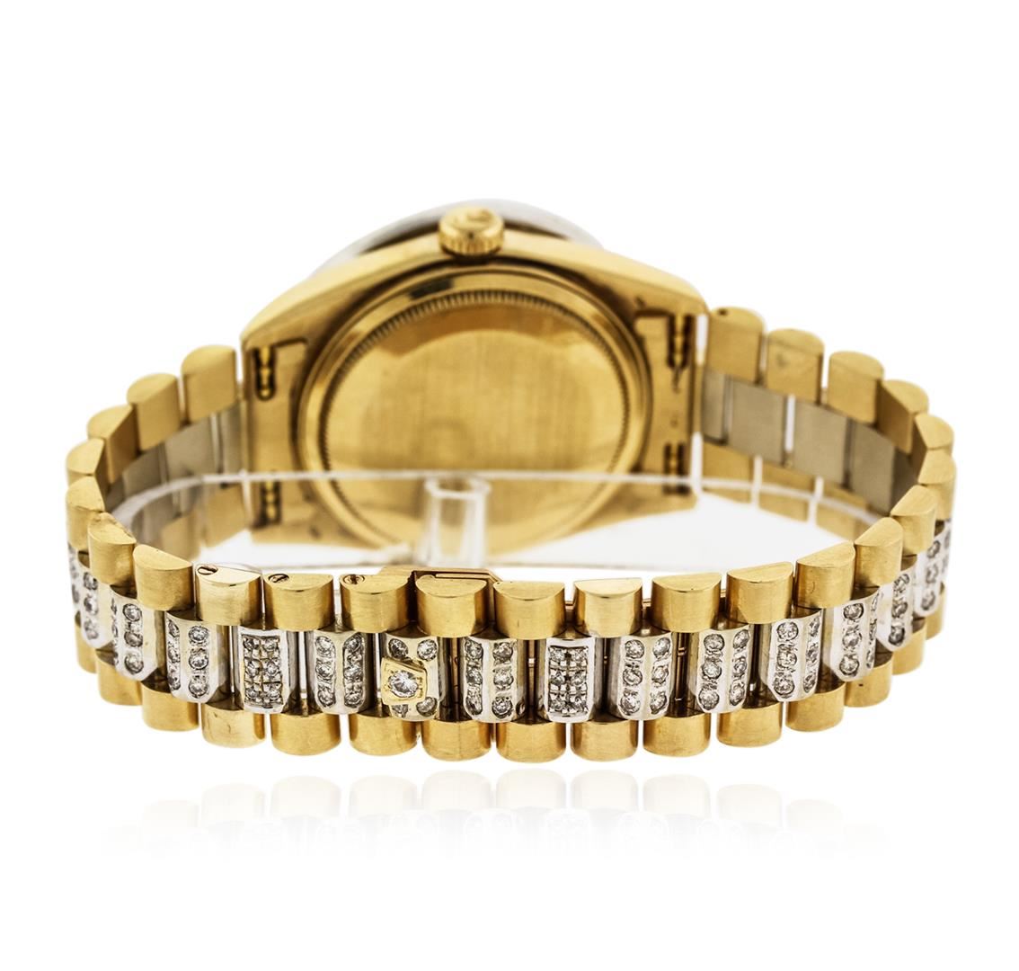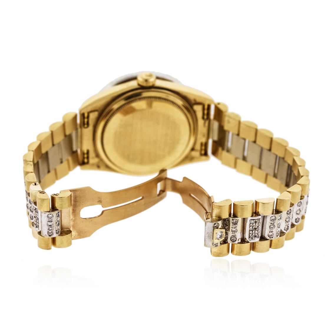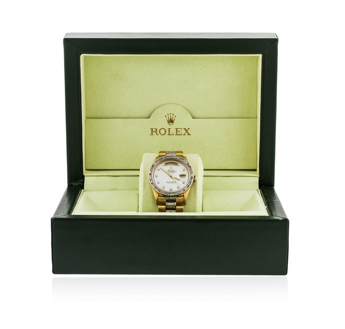 One gents, Rolex DayDate Model, Super President Crown Collection Style wristwatch electronically tested, 18KT yellow gold Case: 36mm oyster, Crown: twin lock with logo, Custom Bezel: diamond set, Custom Crystal: synthetic sapphire cyclops lens. Circa 1984.Movement: superlative chronometer, Custom Dial: light mother of pearl, Calendar: single quick set, Custom Italian 18KT yellow gold Bracelet: diamonds set throughout, Crown Collection style, Condition: G-4 Average. Seven and three quarter inch length. Concealed deployment clasp. Containing: Approximately One Hundred Eighty; baguette, and round brilliant cut, diamonds, approximate total weight equals 4.20ct. Set and graded in the bracelet, and the bezel. Clarity: VS-2 to SI-2 Average. Color: G - H. Total Weight of Diamonds 4.20ct. Total Weight of Watch 155.83 grams. AIG Appraised at $31,550.00.