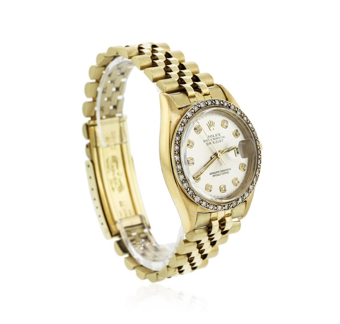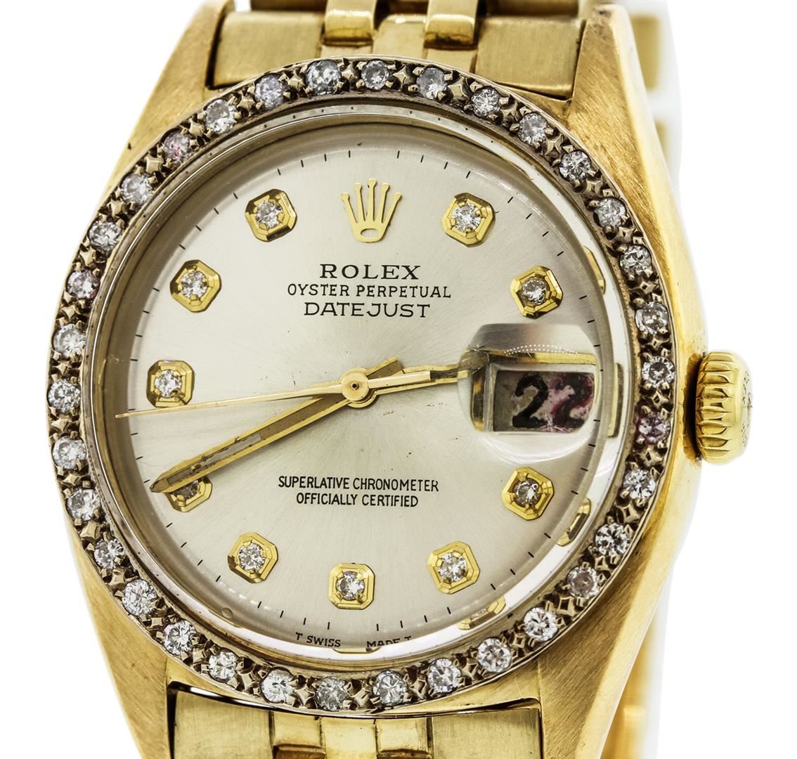One gents, hand crafted & machine milled Rolex DateJust Model wristwatch electronically tested. 18KT yellow gold, Case: 35mm oyster, 18KT yellow gold Crown: twin lock with logo, Custom Bezel: diamond set, Crystal: acrylic cyclops lens. Movement: superlative chronometer, Custom Dial: Silvered, with baton hands & diamond markers, Date Window: 3 o'clock position non-quick set, Custom Date Wheel: Red numerals, Bracelet: 14KT yellow gold, bright & satin finish, Condition: G-4 Average. Seven and one half inch length. Standard clasp, with logo. Containing: Thirty Four prong set round brilliant cut diamonds, approximate total weight equals 0.80ct. Set & graded in the bezel. Clarity I-1 to I-2. Color G - I. Total Weight of Diamonds 0.80ct. Total Weight of Watch 107.03 grams. AIG appraised at $14,000.00. AIG Appraised at $14,000.00.