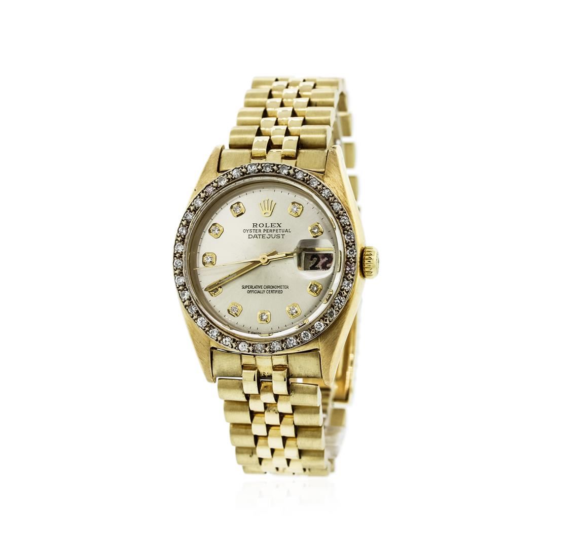 One gents, hand crafted & machine milled Rolex DateJust Model wristwatch electronically tested. 18KT yellow gold, Case: 35mm oyster, 18KT yellow gold Crown: twin lock with logo, Custom Bezel: diamond set, Crystal: acrylic cyclops lens. Movement: superlative chronometer, Custom Dial: Silvered, with baton hands & diamond markers, Date Window: 3 o'clock position non-quick set, Custom Date Wheel: Red numerals, Bracelet: 14KT yellow gold, bright & satin finish, Condition: G-4 Average. Seven and one half inch length. Standard clasp, with logo. Containing: Thirty Four prong set round brilliant cut diamonds, approximate total weight equals 0.80ct. Set & graded in the bezel. Clarity I-1 to I-2. Color G - I. Total Weight of Diamonds 0.80ct. Total Weight of Watch 107.03 grams. AIG appraised at $14,000.00. AIG Appraised at $14,000.00.