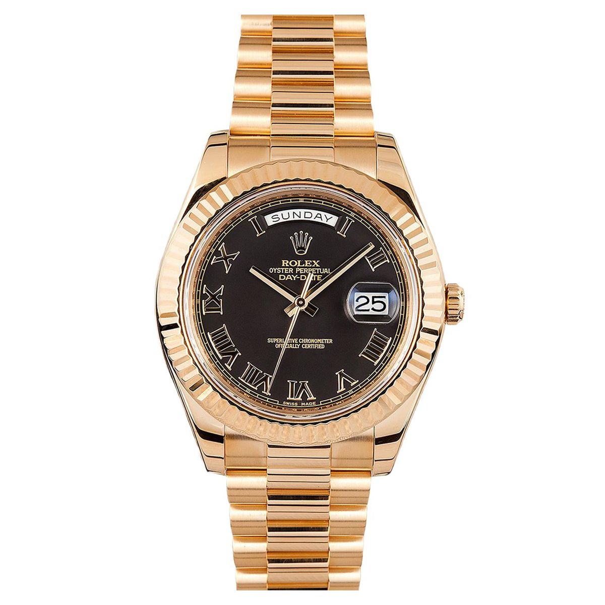 One gents 18KT yellow gold Rolex Presidential Day Date II wristwatch. Model Name/Number: President 218238 (Day-Date). The watch features automatic movement with date, scratch-resistant sapphire crystal, waterproof screw-down crown, double Quickset, inner reflector ring engraved with serial number. Case: 18k yellow gold with fluted bezel (41 mm). Dial: Black with yellow gold Roman numeral hour markers. Bracelet: 18k yellow gold Presidential with hidden clasp.