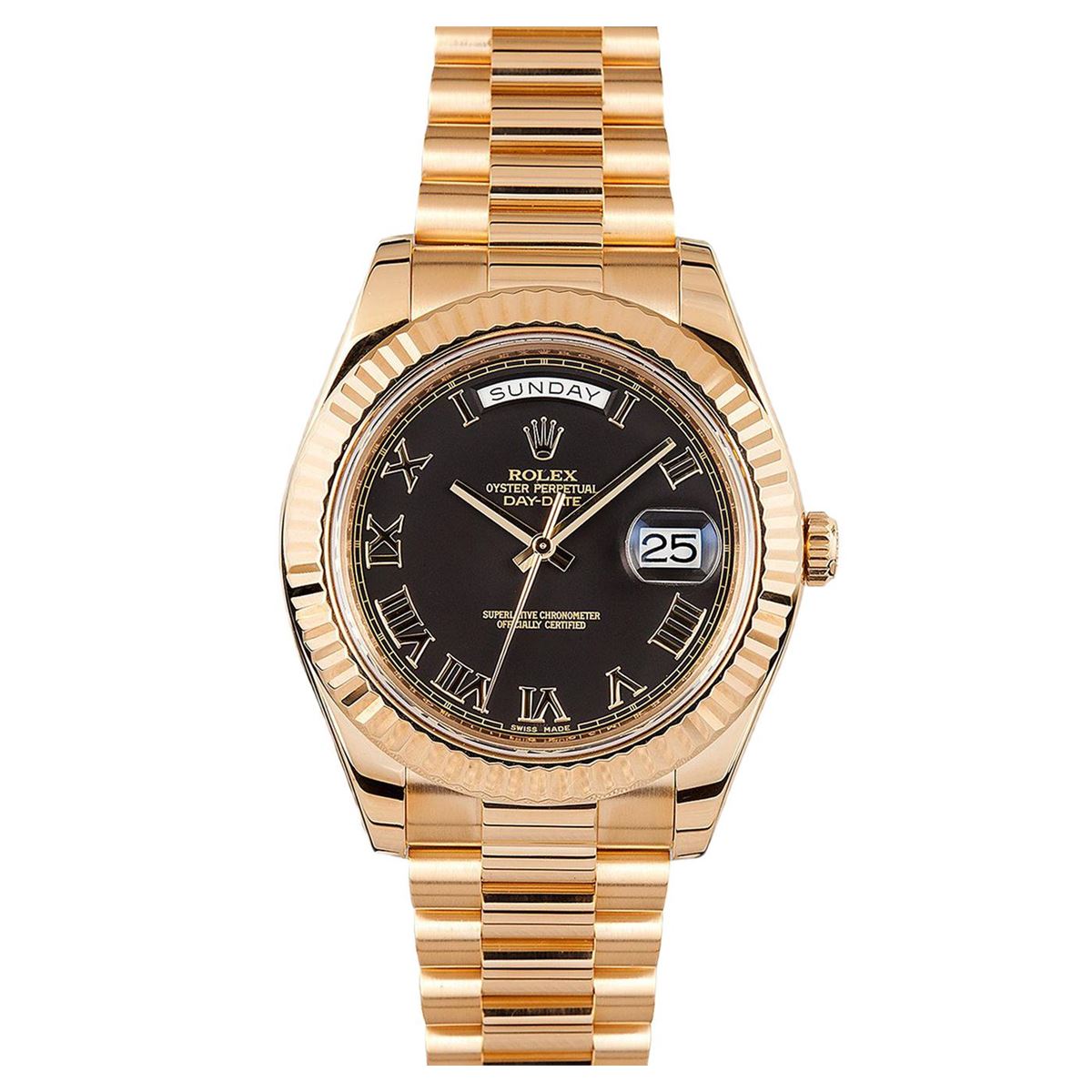 One gents 18KT yellow gold Rolex Presidential Day Date II wristwatch. Model Name/Number: President 218238 (Day-Date). The watch features automatic movement with date, scratch-resistant sapphire crystal, waterproof screw-down crown, double Quickset, inner reflector ring engraved with serial number. Case: 18k yellow gold with fluted bezel (41 mm). Dial: Black with yellow gold Roman numeral hour markers. Bracelet: 18k yellow gold Presidential with hidden clasp.