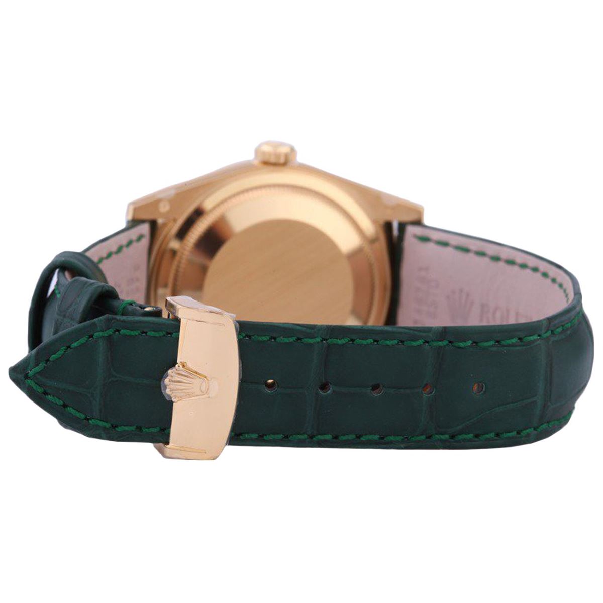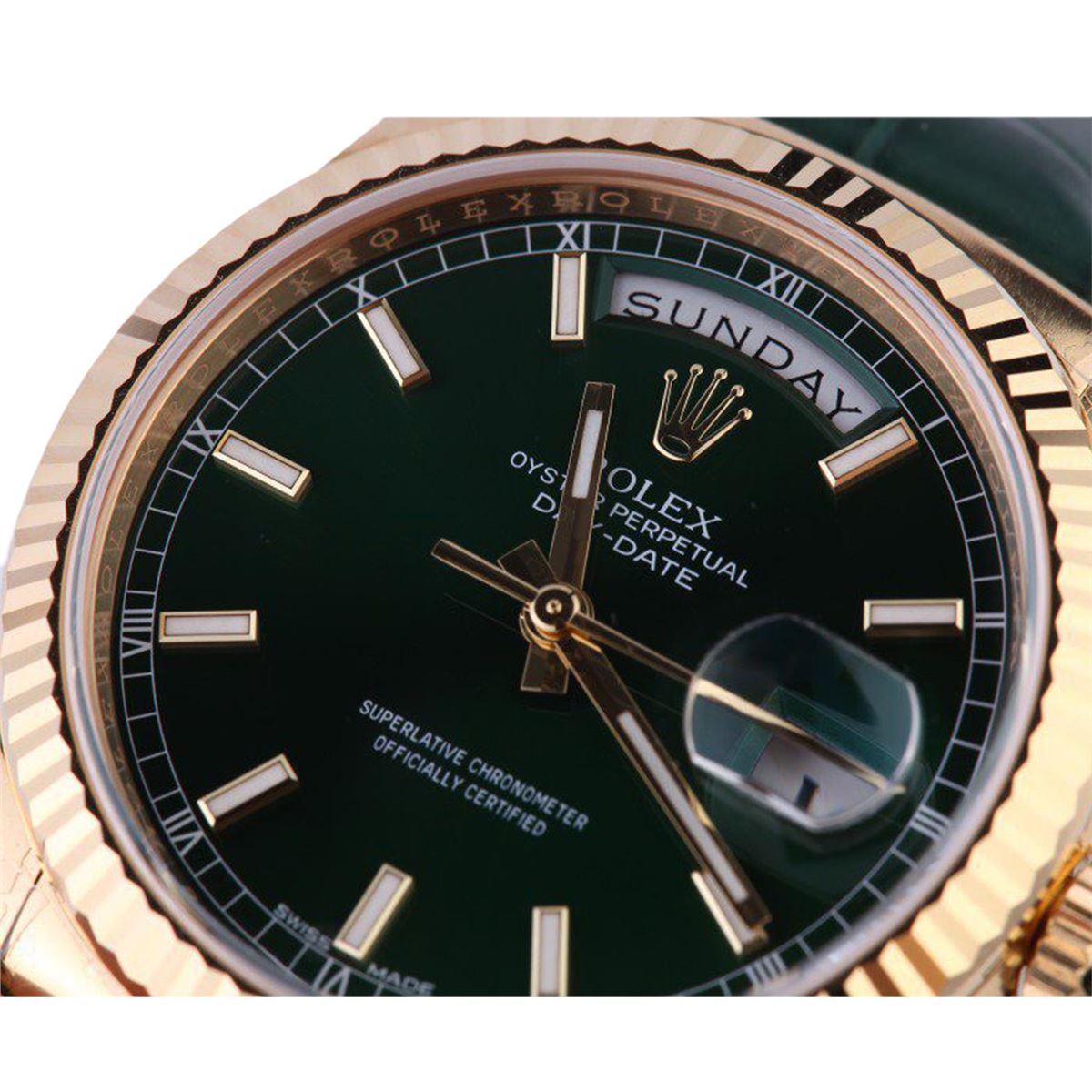 One gents 18KT yellow gold Rolex Presidential Day Date wristwatch. Model Name/Number: Day-Date (President) 118138. The watch features automatic movement with day-date, scratch resistant sapphire crystal, calibre 3155 waterproof, screw-down crown, double quickset. Case: 18k yellow gold with fluted bezel (36mm). Dial: Green with luminous index hour markers. Bracelet: Rolex leather strap with 18k yellow gold deployment buckle.