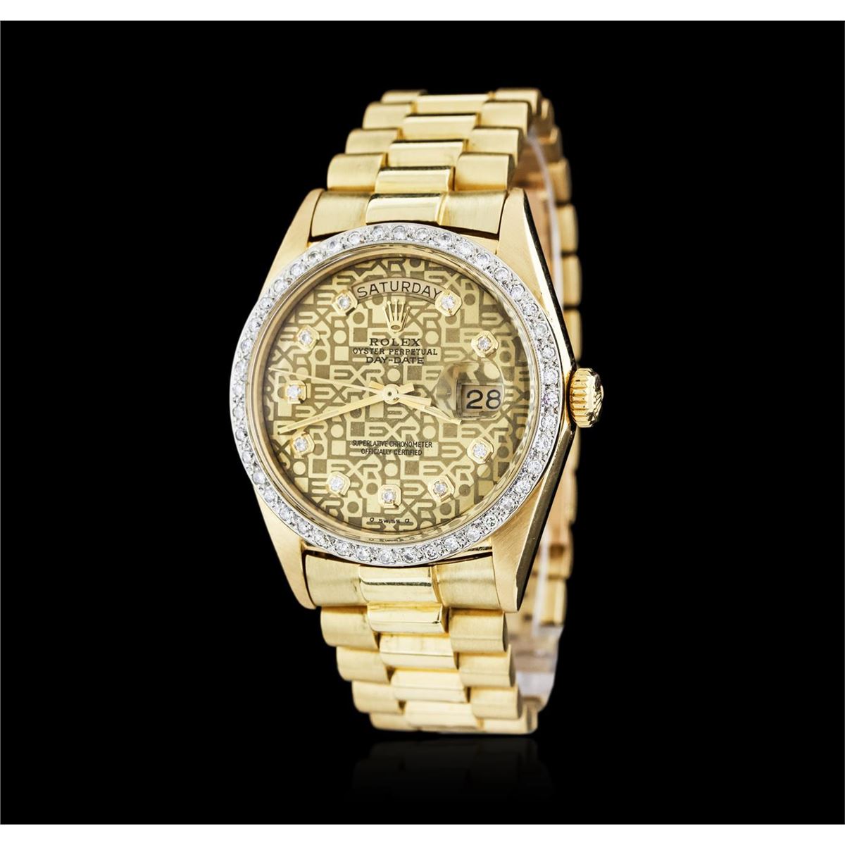 One gents, hand crafted & machine milled Rolex DayDate Model wristwatch electronically tested 18KT yellow gold, Case: 36mm oyster, Crown: twin lock with logo, Custom Bezel: diamond set, Custom Crystal: acrylic cyclops lens, Circa 1969. Movement: superlative chronometer, Custom Dial: Jubilee, with baton hands, & diamond markers, Calendar: non-quick set, Custom Italian Bracelet: 18KT yellow gold, bright polish & brushed finish, Condition: G-4 Average. Seven and one quarter inch length. Custom Concealed deployment clasp, with logo Containing: Forty Four prong set round brilliant cut diamonds, approximate total weight equals 0.56ct. Set & graded in the bezel. Clarity: SI-1 to SI-2. Color: I - K. Total Weight of Diamonds 0.56ct. Total Weight of Watch 127.24gm. AIG Appraised at $23,000.00.