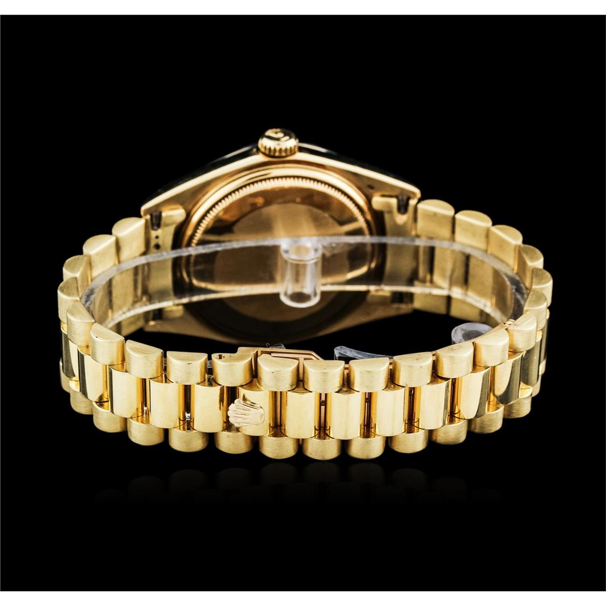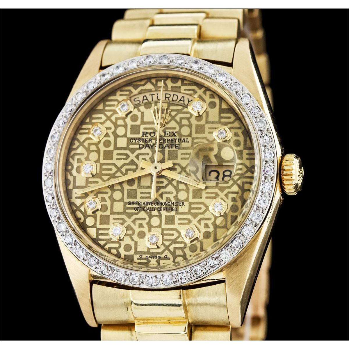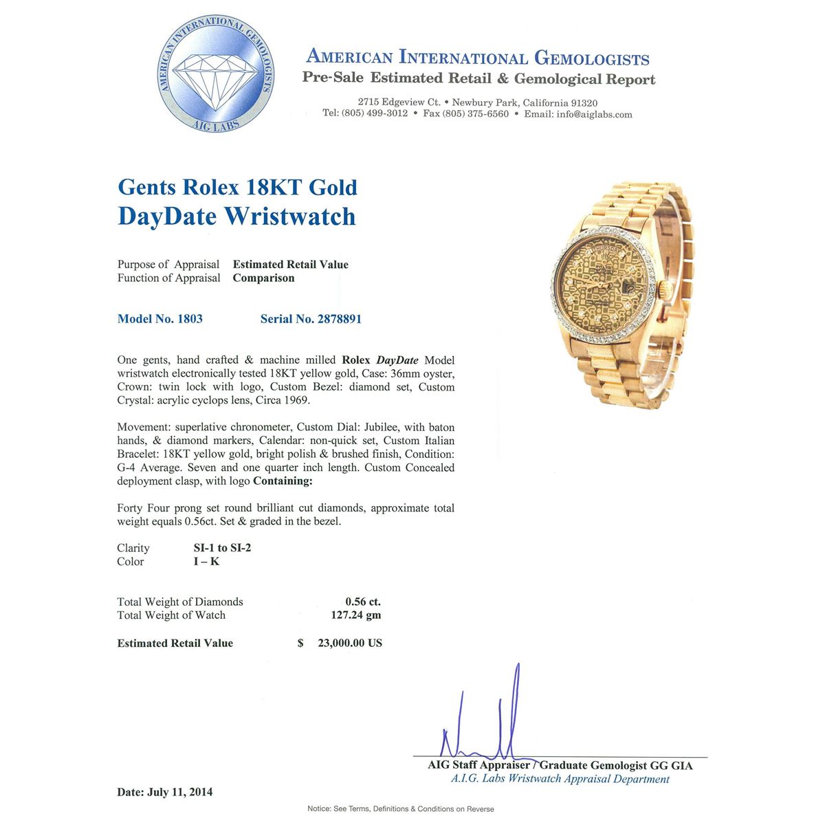 One gents, hand crafted & machine milled Rolex DayDate Model wristwatch electronically tested 18KT yellow gold, Case: 36mm oyster, Crown: twin lock with logo, Custom Bezel: diamond set, Custom Crystal: acrylic cyclops lens, Circa 1969. Movement: superlative chronometer, Custom Dial: Jubilee, with baton hands, & diamond markers, Calendar: non-quick set, Custom Italian Bracelet: 18KT yellow gold, bright polish & brushed finish, Condition: G-4 Average. Seven and one quarter inch length. Custom Concealed deployment clasp, with logo Containing: Forty Four prong set round brilliant cut diamonds, approximate total weight equals 0.56ct. Set & graded in the bezel. Clarity: SI-1 to SI-2. Color: I - K. Total Weight of Diamonds 0.56ct. Total Weight of Watch 127.24gm. AIG Appraised at $23,000.00.