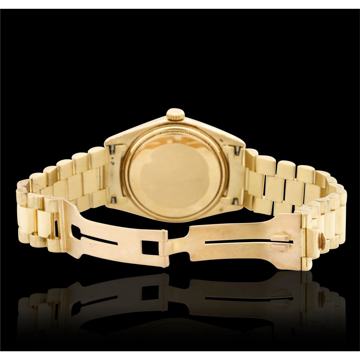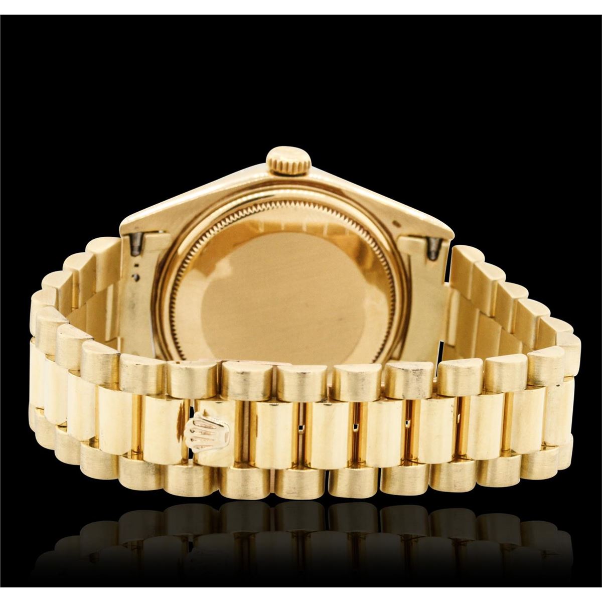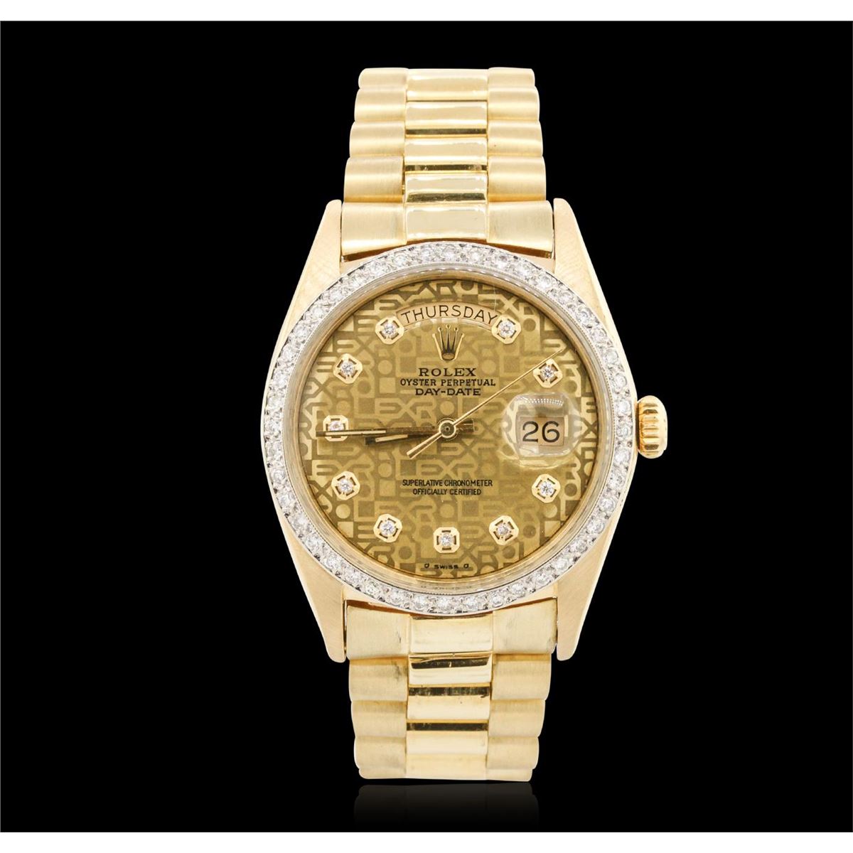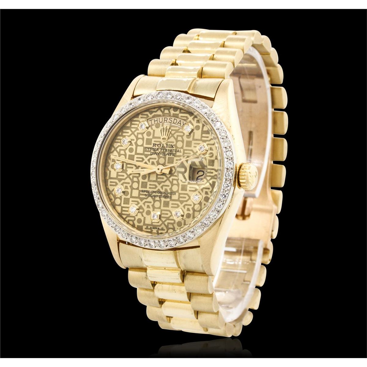 One gents, hand crafted & machine milled Rolex DayDate Model wristwatch electronically tested 18KT yellow gold, Case: 36mm oyster, Crown: twin lock with logo, Custom Bezel: diamond set, Custom Crystal: acrylic cyclops lens, Circa 1969. Movement: superlative chronometer, Custom Dial: Jubilee, with baton hands, & diamond markers, Calendar: non-quick set, Custom Italian Bracelet: 18KT yellow gold, bright polish & brushed finish, Condition: G-4 Average. Seven and one quarter inch length. Custom Concealed deployment clasp, with logo Containing: Forty Four prong set round brilliant cut diamonds, approximate total weight equals 0.56ct. Set & graded in the bezel. Clarity: SI-1 to SI-2. Color: I - K. Total Weight of Diamonds 0.56ct. Total Weight of Watch 127.24gm. AIG Appraised at $23,000.00.