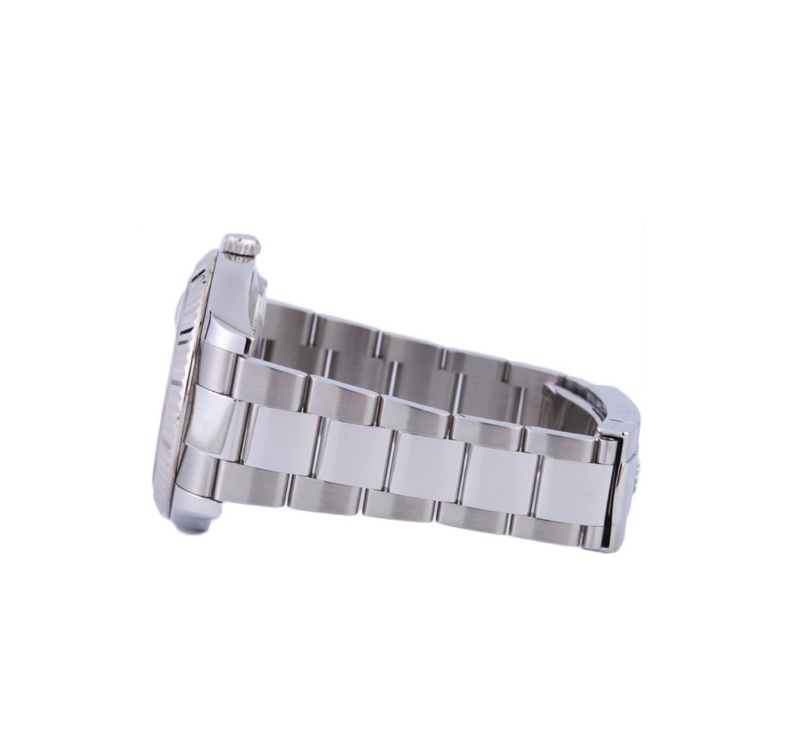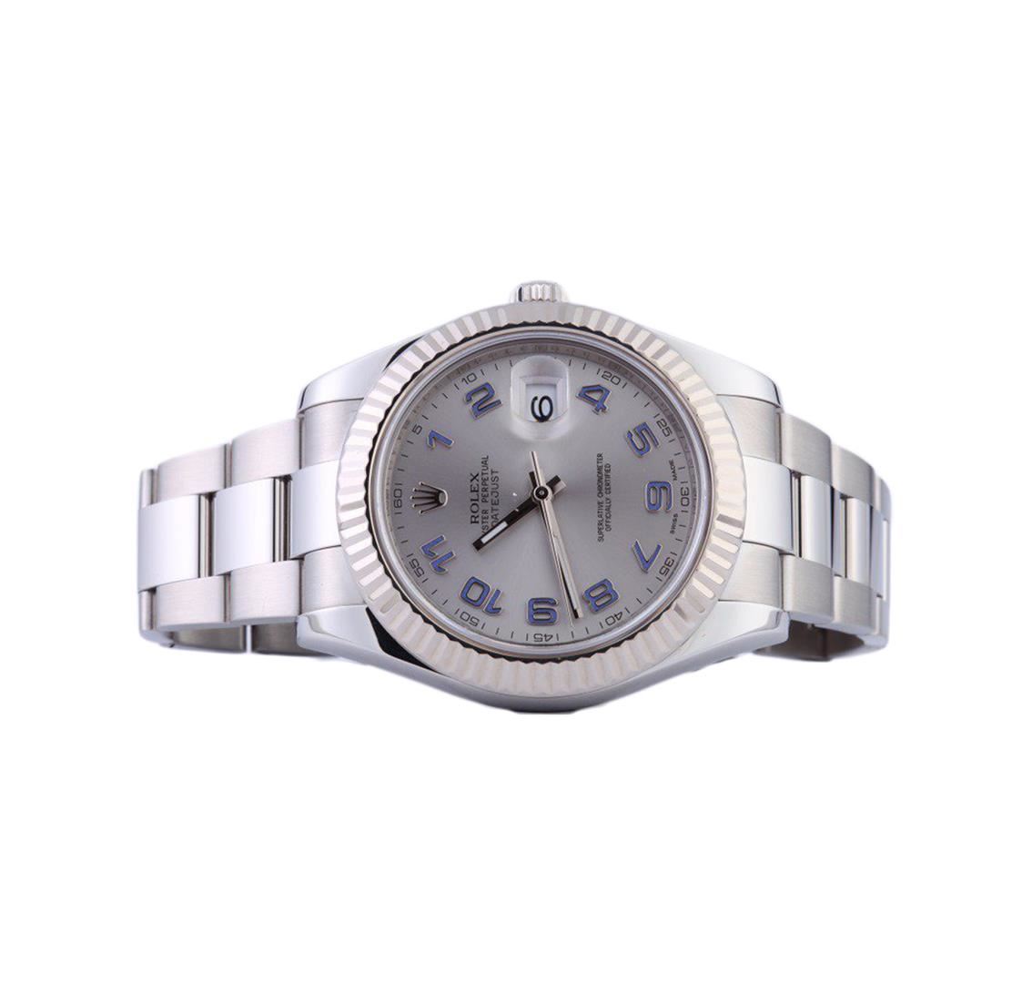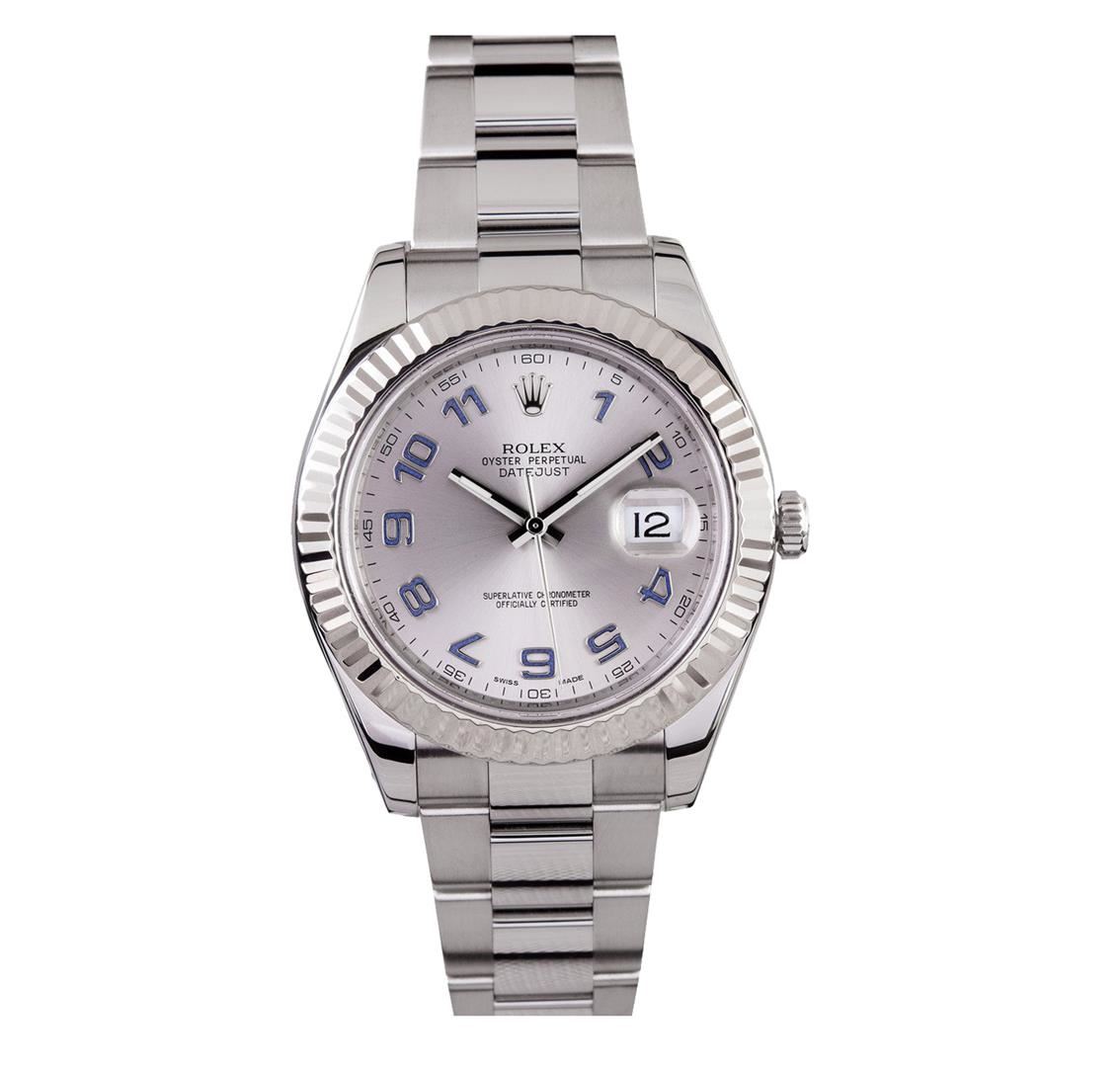 One gents stainless steel Rolex DateJust II wristwatch. Model Name/Number: DateJust II 116334. The watch features automatic movement with date, quickset, scratch-resistant sapphire crystal, waterproof screw-down crown, inner reflector ring engraved with serial number. Case: Stainless steel with 18kt white gold fluted bezel (41mm). Dial: Satin Gray (Rhodium) with Arabic hour markers. Bracelet: Stainless steel Oyster.