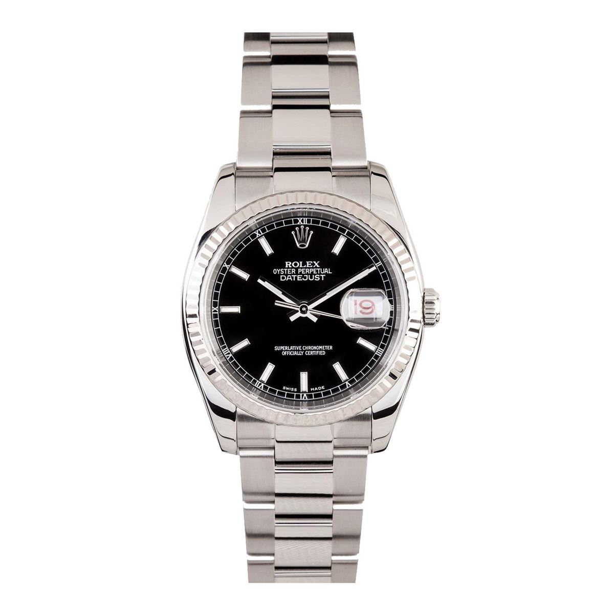One gents stainless steel Rolex DateJust wristwatch. Model Name/Number: DateJust 116234. The watch features automatic movement with date, scratch-resistant sapphire crystal, waterproof screw-down crown. Case: Stainless steel with 18k white gold fluted bezel (36mm). Dial: Black Index with white chapter ring. Bracelet: Stainless steel Oyster.
