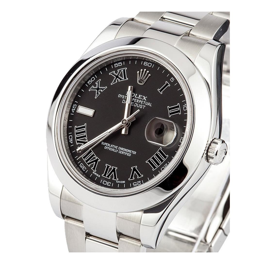 One gents stainless steel Rolex DateJust wristwatch. Model Name/Number: Datejust 116300. The watch features automatic movement with date, quickset, scratch-resistant sapphire crystal, waterproof screw-down crown. Case: Stainless steel with smooth bezel (41 mm), inner reflector ring engraved with serial number. Dial: Black with Roman numeral hour markers. Bracelet: Stainless Steel Oyster.