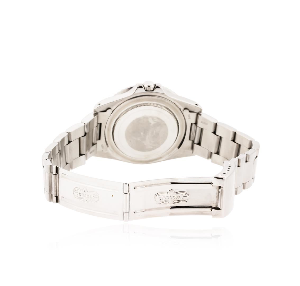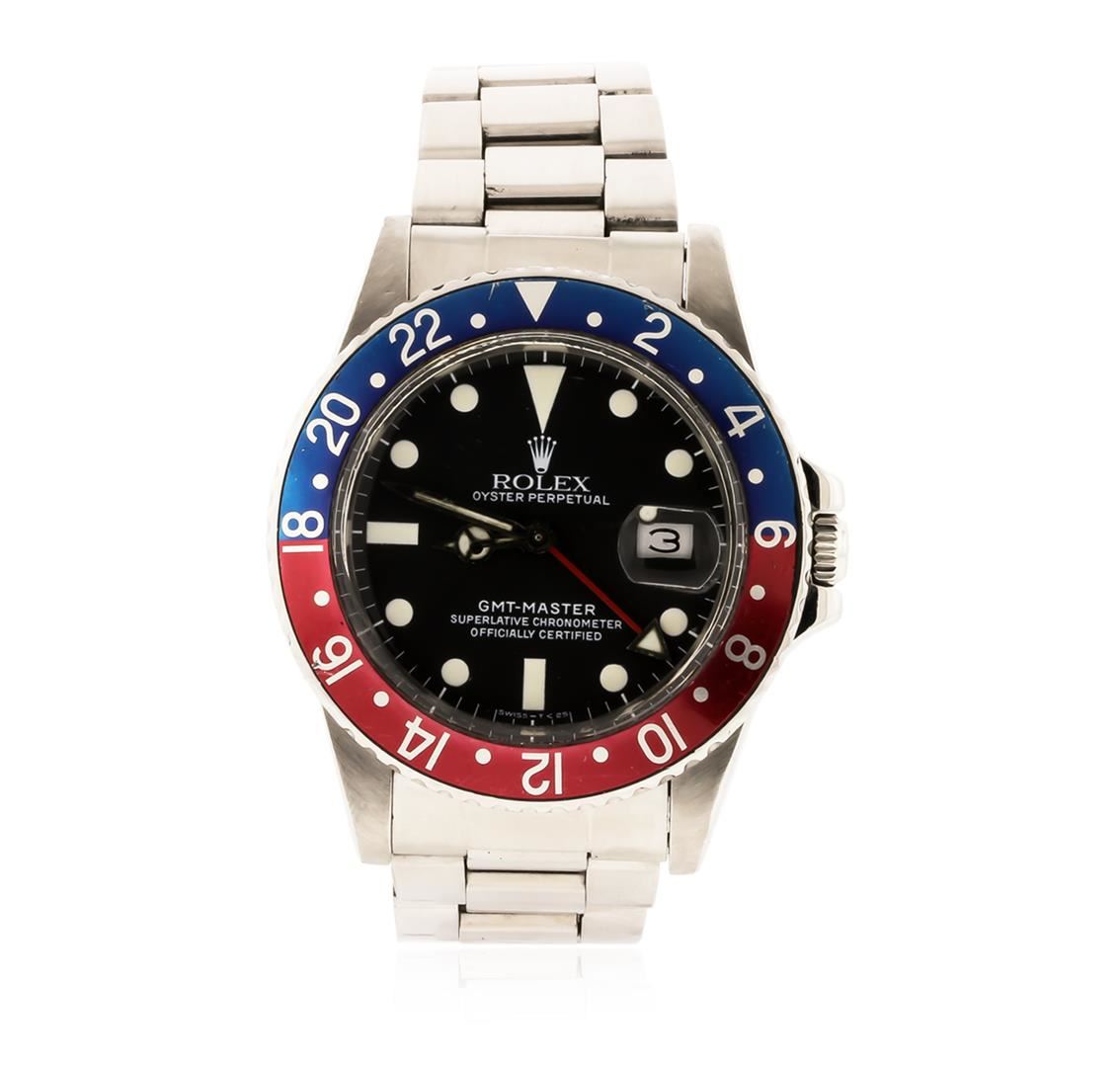 One gents, hand crafted & machine milled Rolex Date GMT-Master model wristwatch electronically tested stainless steel, Case: 38mm oyster, Crown: twin lock with logo, set within protective shoulders, Bi-Directional Rotating Bezel: 24 Hour Blue & Red color insert, Crystal: acrylic cyclops lens. Movement: superlative chronometer, automatic, Dial: black, with luminous dual time zone hands and indices, Calendar: quick set, Bracelet: stainless steel oyster, Condition: G-5 Fine. Circa: 1983, Eight inch length, adjustable. Standard clasp, with logo. Total Weight of Watch 110.04gm. AIG Appraised at $6,880.00.