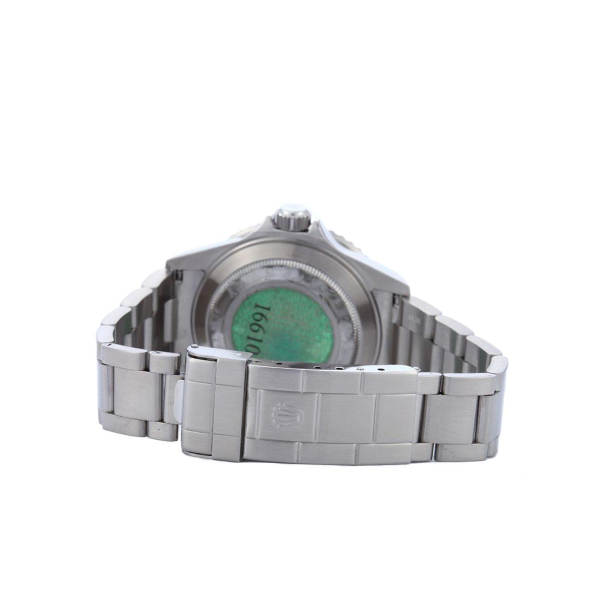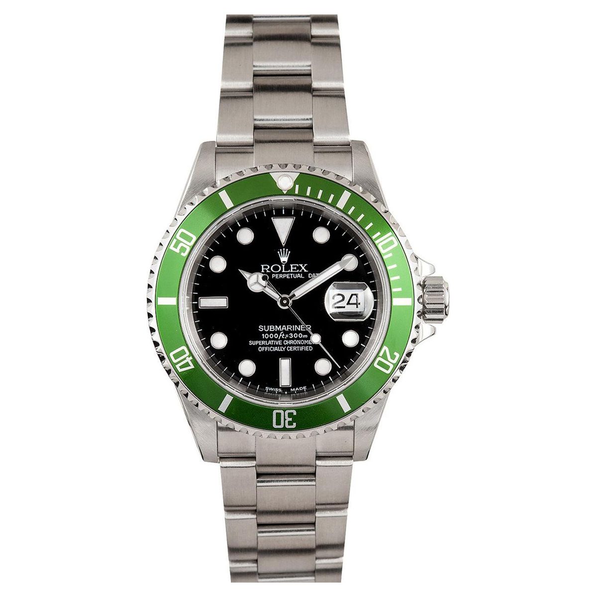 One gents stainless steel Rolex Submariner Anniversary Edition wristwatch. Model Name/Number: Submariner 16610. The watch features automatic movement with date, waterproof screw-down crown, unidirectional rotatable diver's bezel, scratch-resistant sapphire crystal. Case: Stainless steel with green anniversary edition bezel, no holes case. Dial: Black with luminous markers. Bracelet: Stainless Steel Oyster.