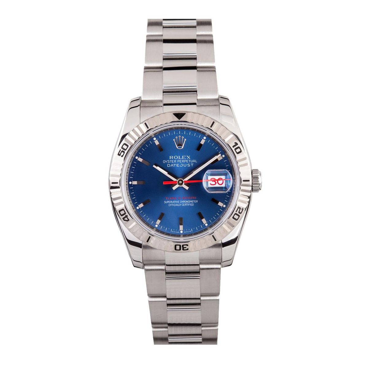 One gents stainless steel Rolex DateJust wristwatch. Model Name/Number: Thunderbird DateJust 116264. The watch features automatic movement with date, scratch-resistant sapphire crystal, 31 jewels, waterproof screw-down crown. Case: Stainless steel with18k white gold Thunderbird (rotatable timing) bezel (36mm). Dial: Blue luminous index with red second hand and red date wheel. Bracelet: Stainless steel Oyster.