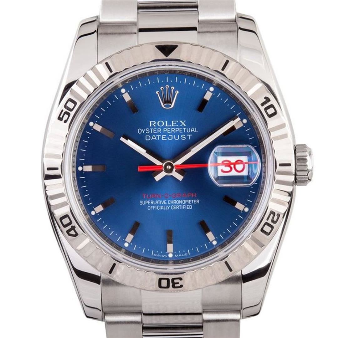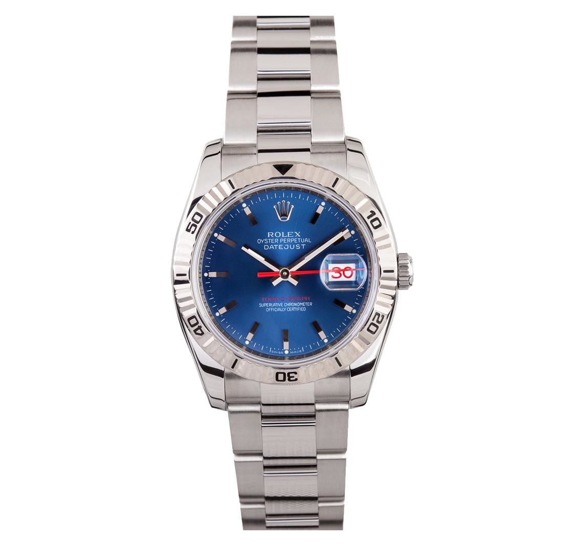 One gents stainless steel Rolex DateJust wristwatch. Model Name/Number: Thunderbird DateJust 116264. The watch features automatic movement with date, scratch-resistant sapphire crystal, 31 jewels, waterproof screw-down crown. Case: Stainless steel with18k white gold Thunderbird (rotatable timing) bezel (36mm). Dial: Blue luminous index with red second hand and red date wheel. Bracelet: Stainless steel Oyster.