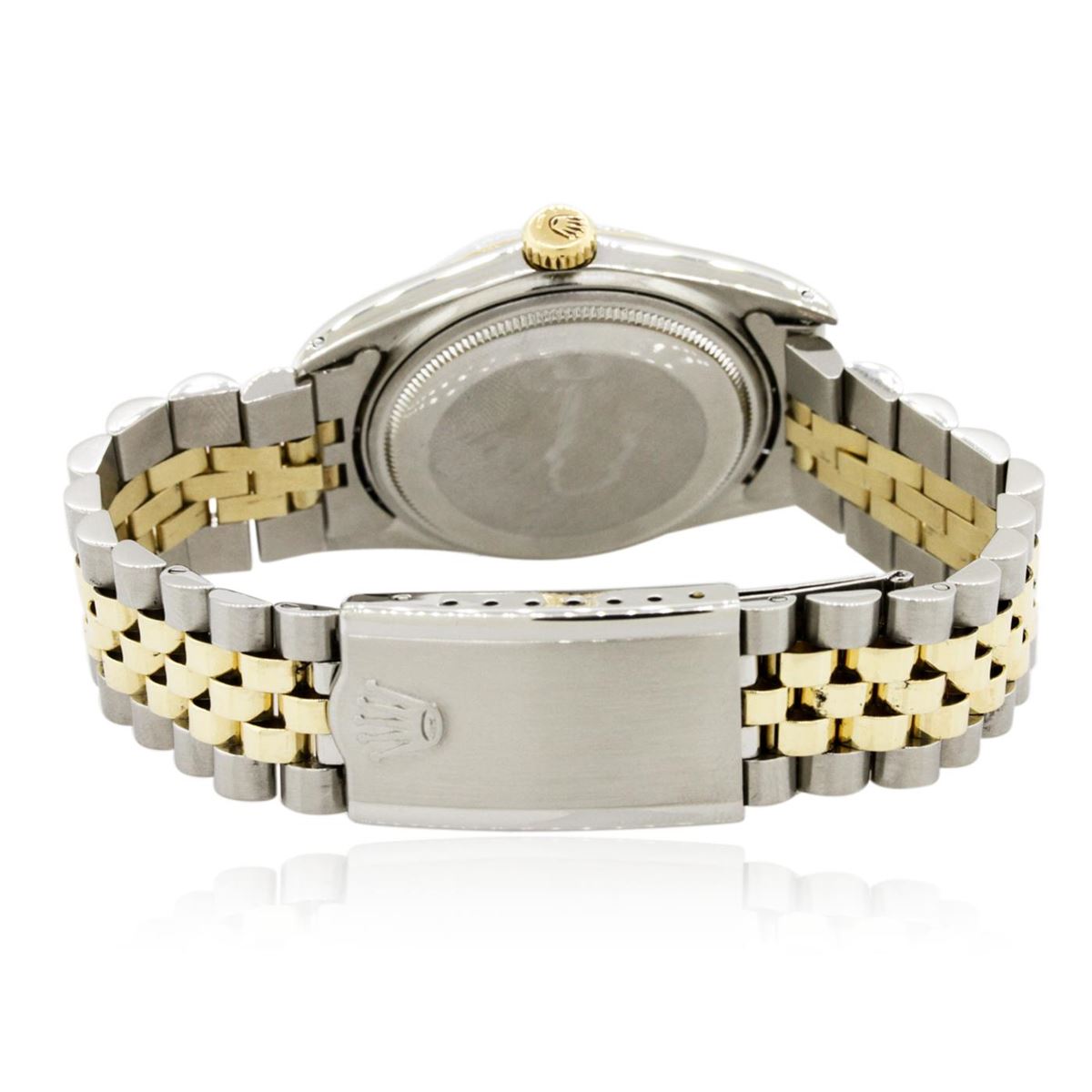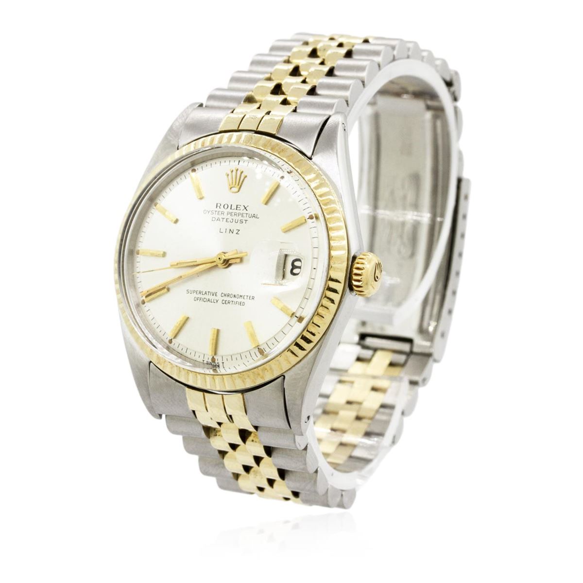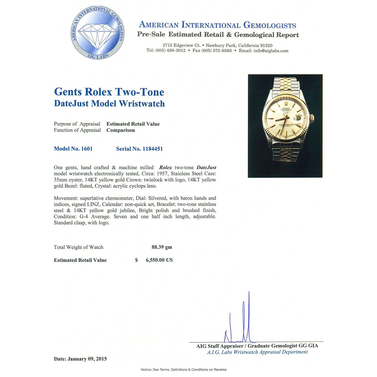 One gents, hand crafted & machine milled Rolex two-tone DateJust model wristwatch electronically tested, Circa: 1957, Stainless Steel Case: 35mm oyster, 14KT yellow gold Crown: twinlock with logo, 14KT yellow gold Bezel: fluted, Crystal: acrylic cyclops lens. Movement: superlative chronometer, Dial: Silvered, with baton hands and indices, signed LINZ, Calendar: non-quick set, Bracelet: two-tone stainless steel & 14KT yellow gold jubilee, Bright polish and brushed finish, Condition: G-4 Average. Seven and one half inch length, adjustable. Standard clasp, with logo. Total Weight of Watch 88.39 grams. AIG Appraised at $6,550.00.