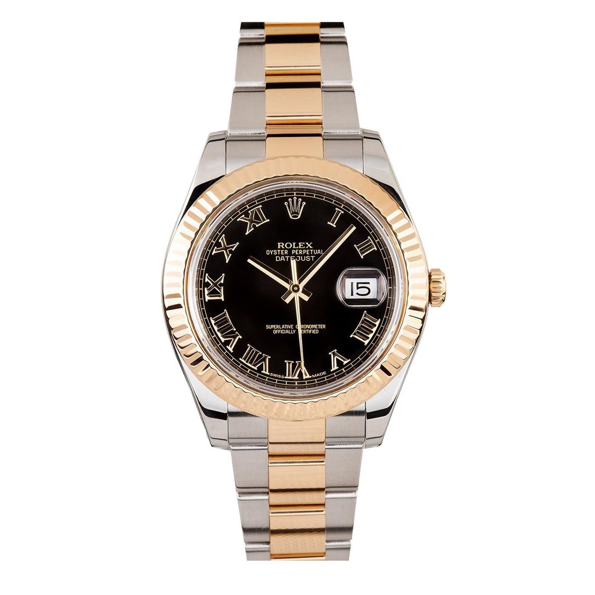 One gents stainless steel and 18KT yellow gold Rolex DateJust II wristwatch. Model Name/Number: DateJust II 116333. The watch features automatic movement with date, Quickset, scratch-resistant sapphire crystal, waterproof screw-down crown. Case: Stainless steel with 18k yellow gold fluted bezel (41mm), inner reflector ring engraved with serial number. Dial: Black with yellow gold Arabic numeral hour markers. Bracelet: Stainless steel and 18k yellow gold Oyster.