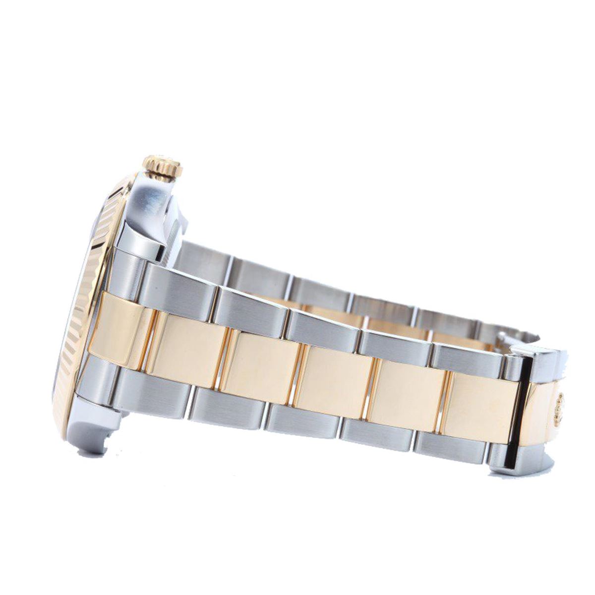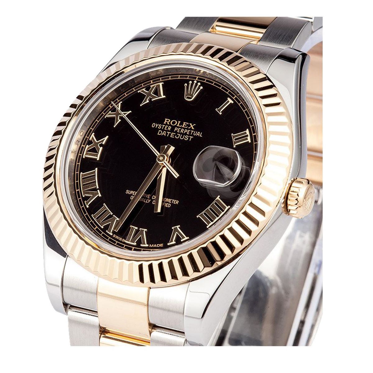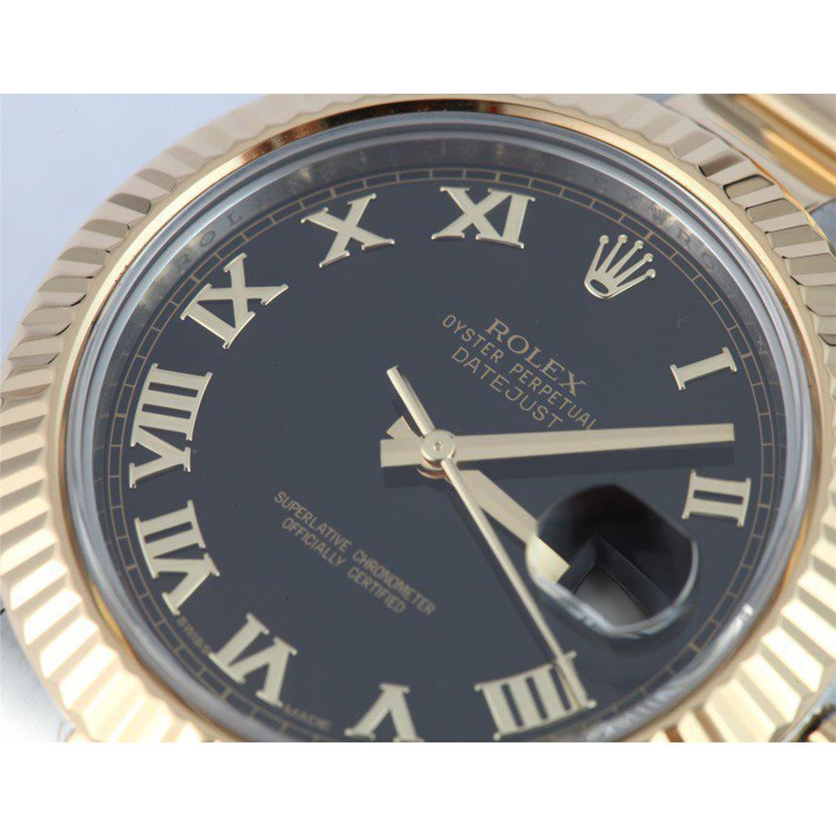 One gents stainless steel and 18KT yellow gold Rolex DateJust II wristwatch. Model Name/Number: DateJust II 116333. The watch features automatic movement with date, Quickset, scratch-resistant sapphire crystal, waterproof screw-down crown. Case: Stainless steel with 18k yellow gold fluted bezel (41mm), inner reflector ring engraved with serial number. Dial: Black with yellow gold Arabic numeral hour markers. Bracelet: Stainless steel and 18k yellow gold Oyster.
