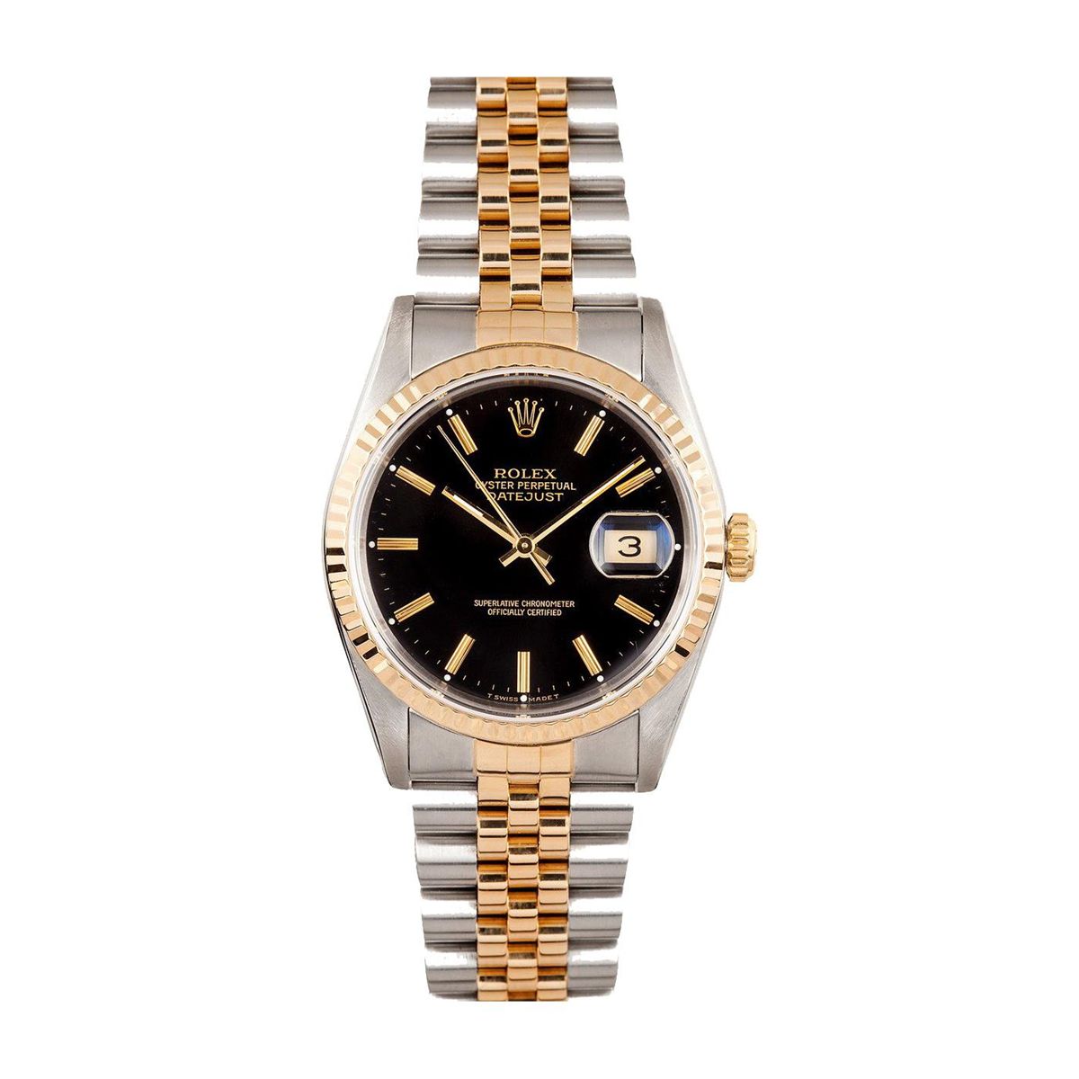 One gents stainless steel and 18KT yellow gold Rolex DateJust wristwatch. Model Name/Number: DateJust 16233. The watch features automatic movement with date, scratch-resistant sapphire crystal, waterproof screw-down crown, Quickset. Case: Stainless steel with 18k yellow gold fluted bezel (36mm). Dial: Black Index. Bracelet: Stainless Steel and 18k yellow gold Jubilee.