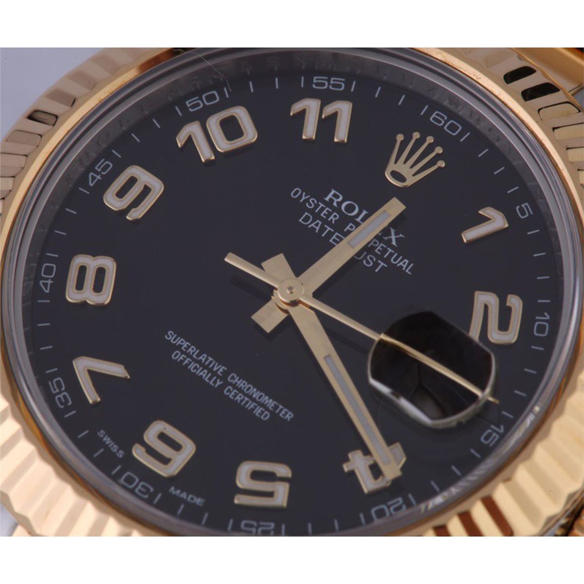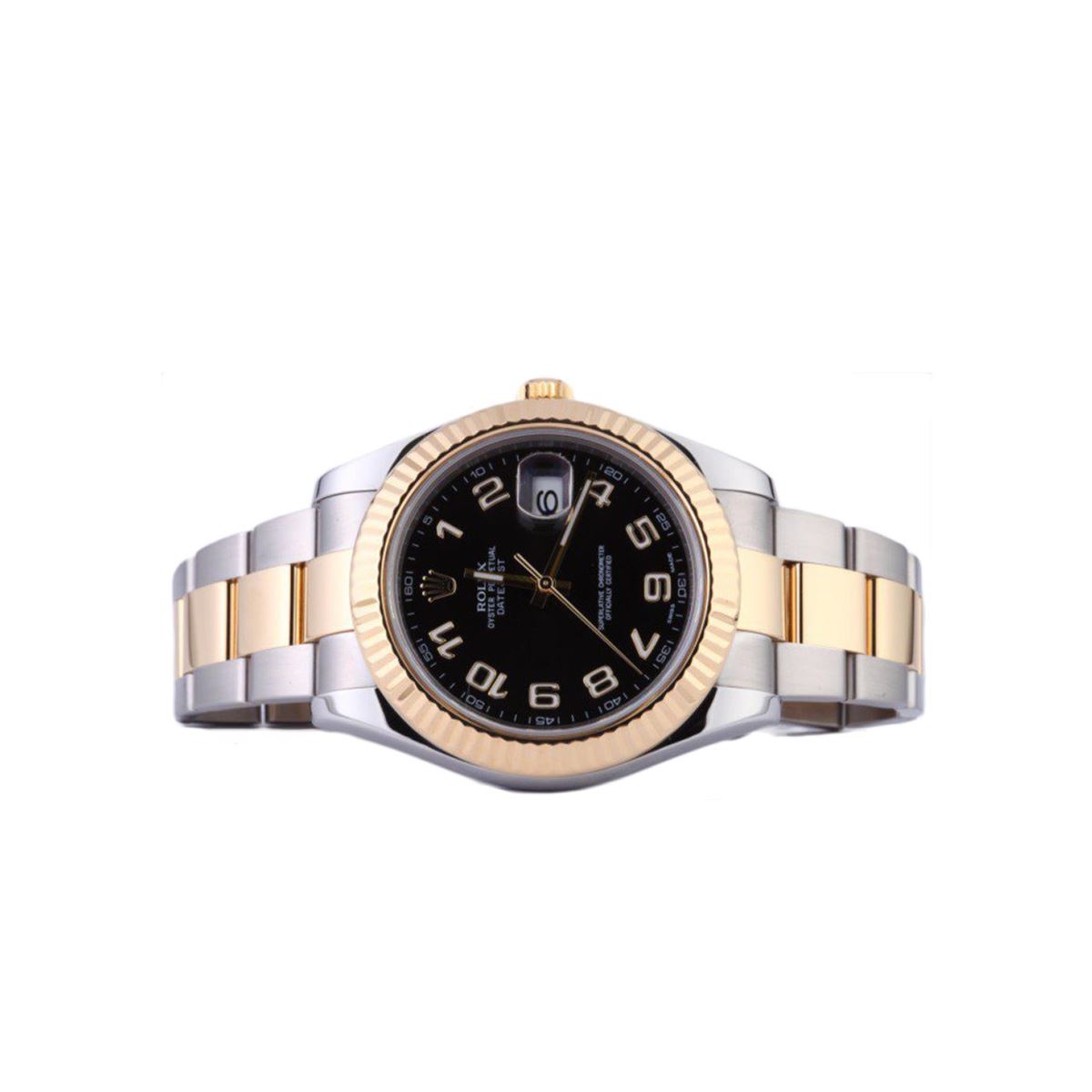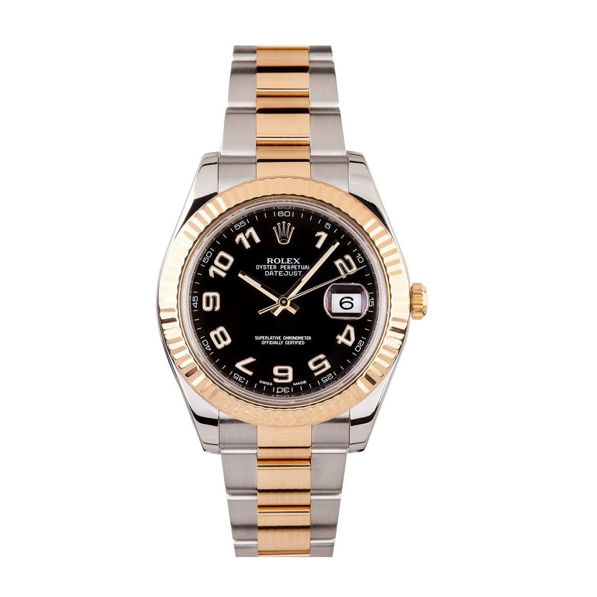 One gents stainless steel and 18KT yellow gold Rolex DateJust wristwatch. Model Name/Number: DateJust 116333. The watch features automatic movement with date, scratch-resistant sapphire crystal, waterproof screw-down crown. Case: Stainless steel with 18k yellow gold fluted bezel (41mm), inner reflector ring engraved with serial number. Dial: Black Arabic. Bracelet: Stainless steel and 18k yellow gold Oyster.