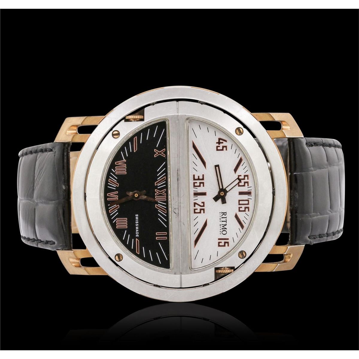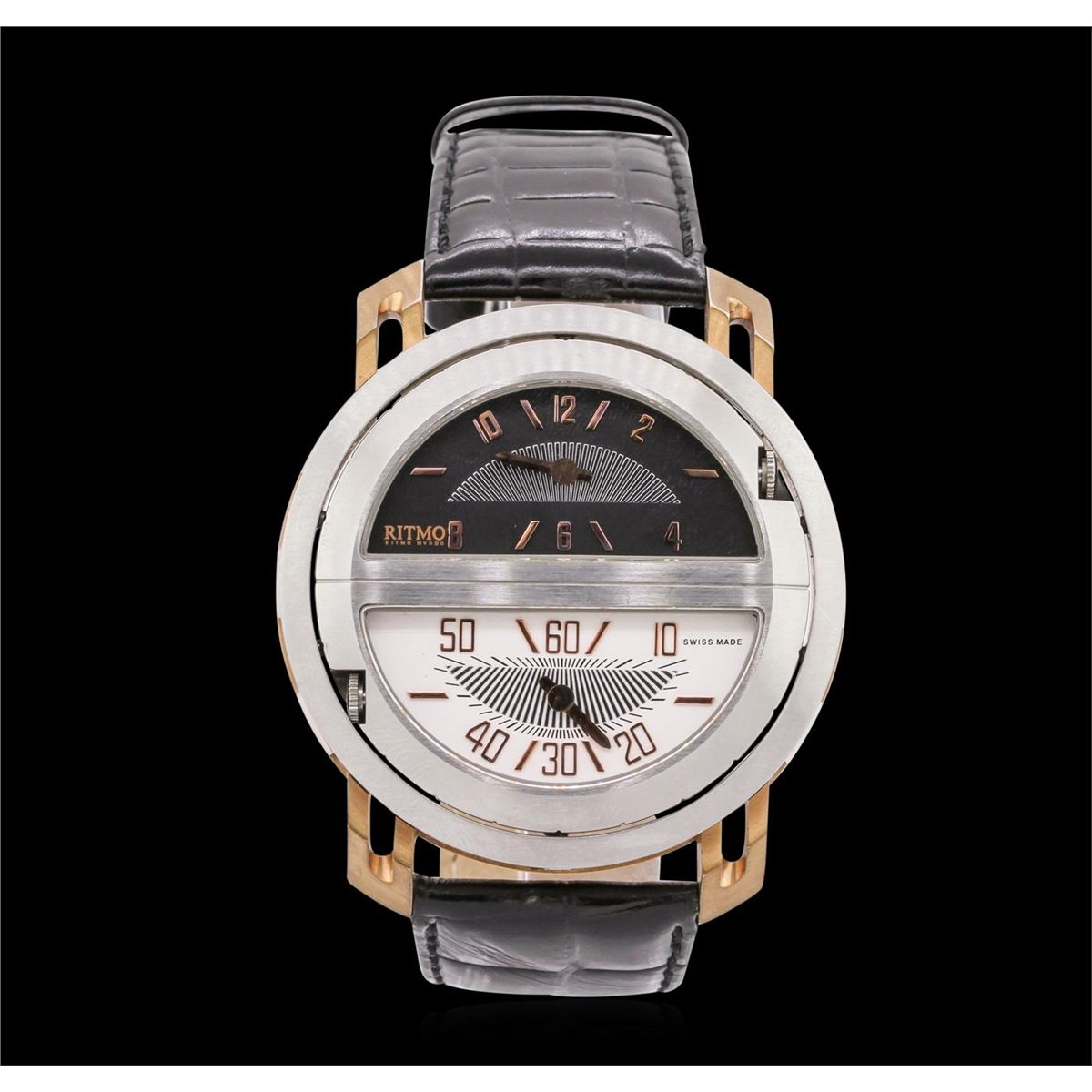 One Gents Stainless Steel Ritmo Mvndo Persepolis Triple Time Model 211 Wristwatch featuring: black leather bracelet with black stitching and steel buckle, stainless steel bezel, lugs, and 52.5mm case, four-section alternating black and white reversible dial with analog display, Roman and Arabic numerals, quartz battery movement, water resistant to 100m, triple time zone, sapphire crystal.