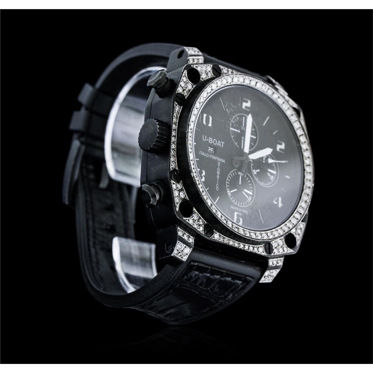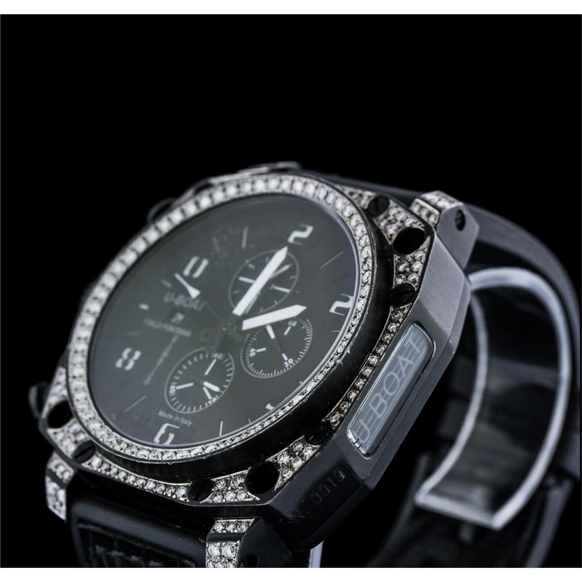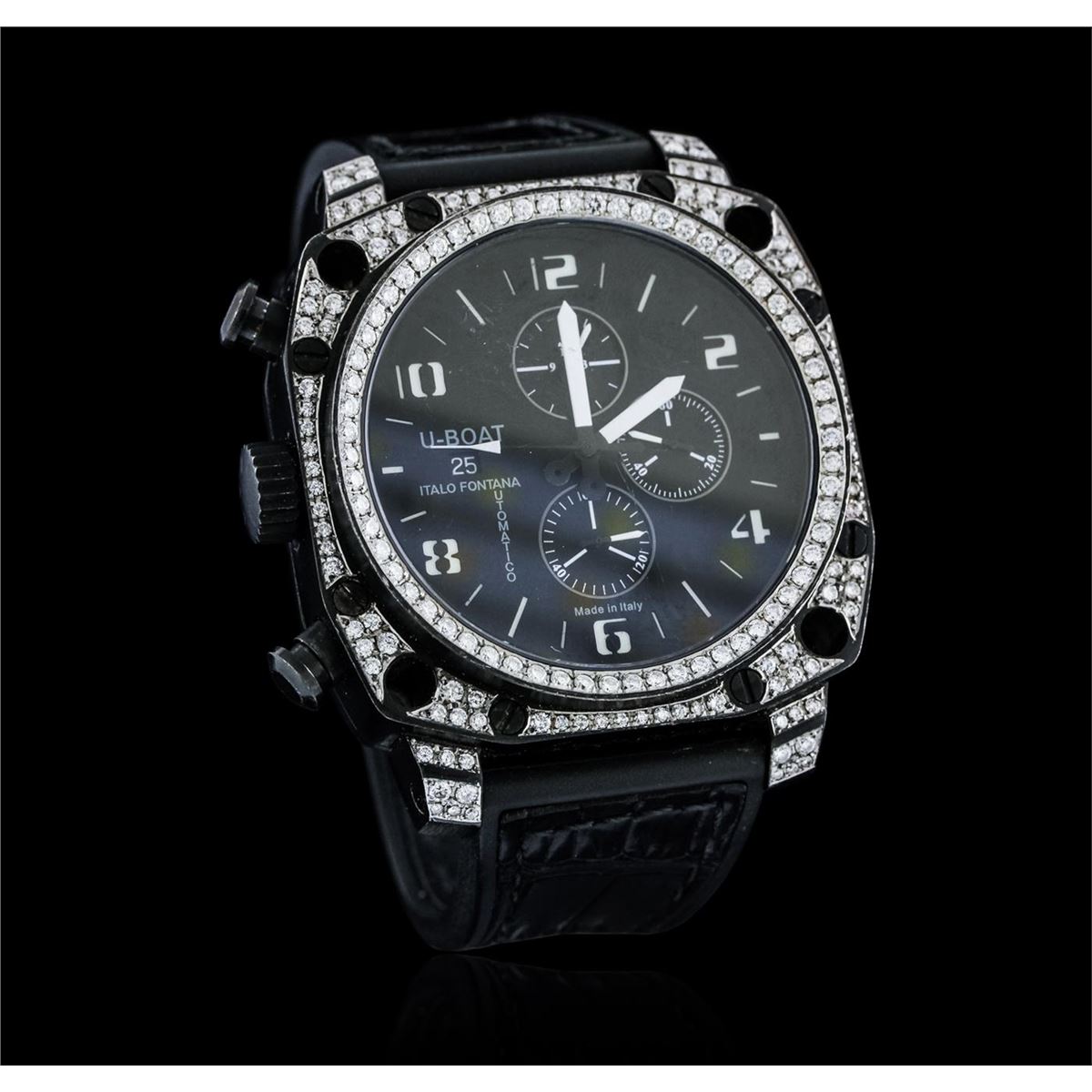 One gents, U-Boat PVD coated steel Thousands of Feet Chronograph model wristwatch electronically tested, Case: 50 x 50mm, Case Back: exhibition, the rotor is visible, the case back is engraved with the manufacturers name, model, and ID numbers, Logo'd Crown, Custom Bezel: diamond set, Crystal: synthetic sapphire. PVD is short for Physical Vapor Deposition. This is a chemical process that creates a very durable tarnish resistant finish, similar to highly polished brass. PVD finish is commonly used for watch cases and bracelets. Movement: automatic, Dial: Black, with luminous hands, indices and numerals, Chronograph Functions: sub dials for; seconds, minutes and hours, Calendar: quick set, Bracelet: leather strap, Condition: G-4 Average. Eight and one half inch length, adjustable. Containing: Approximately One Hundred Seventy Five round brilliant cut diamonds, approximate total weight equals 2.50ct. Set & graded in the bezel, and the case. Clarity VS-2 to SI-2 . Color: G - H. Total Weight of Diamonds 2.50ct. Total Weight of Watch 198.50 gm. AIG Appraised at $9,650.00.