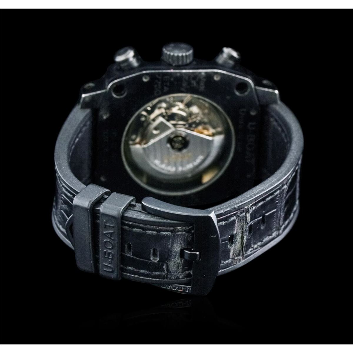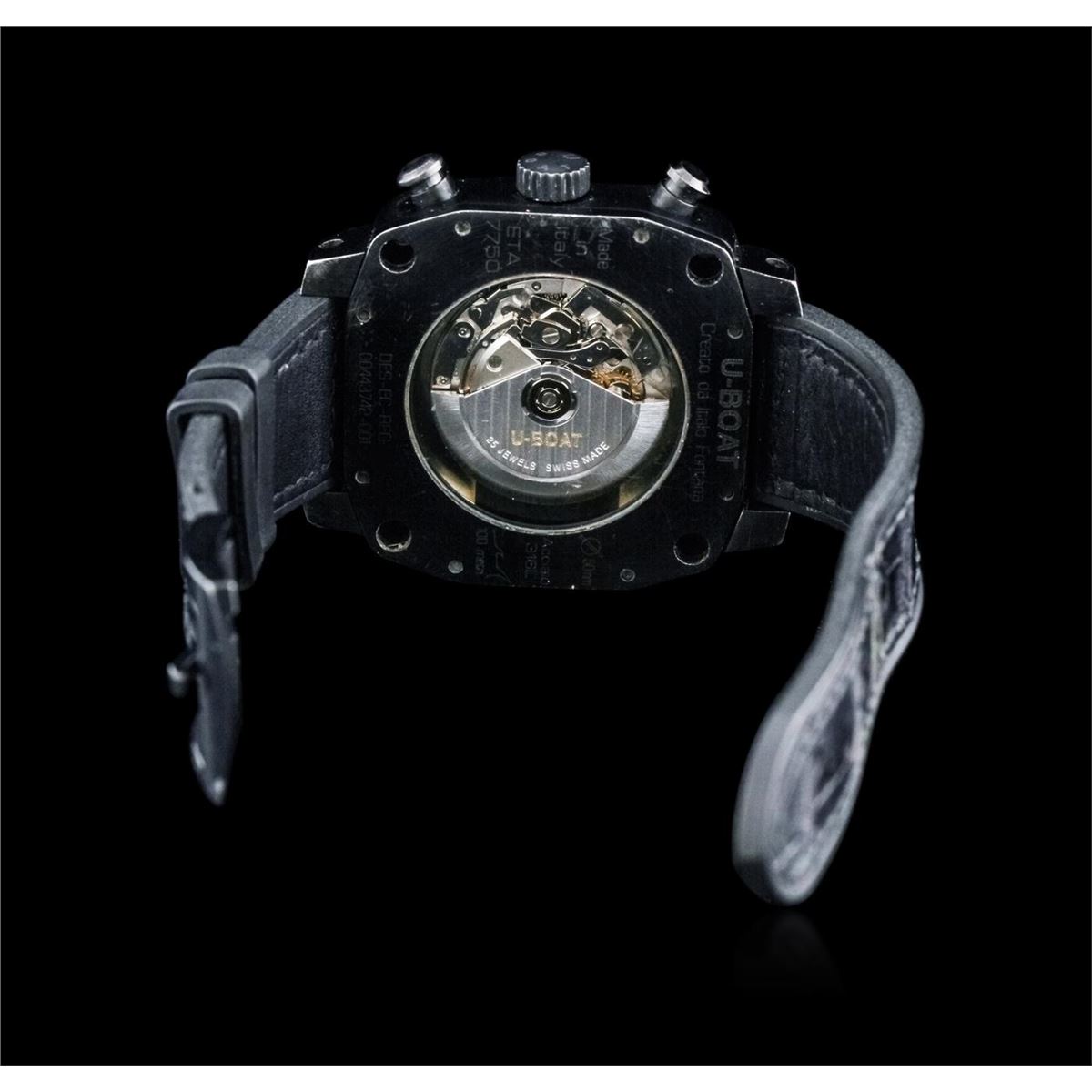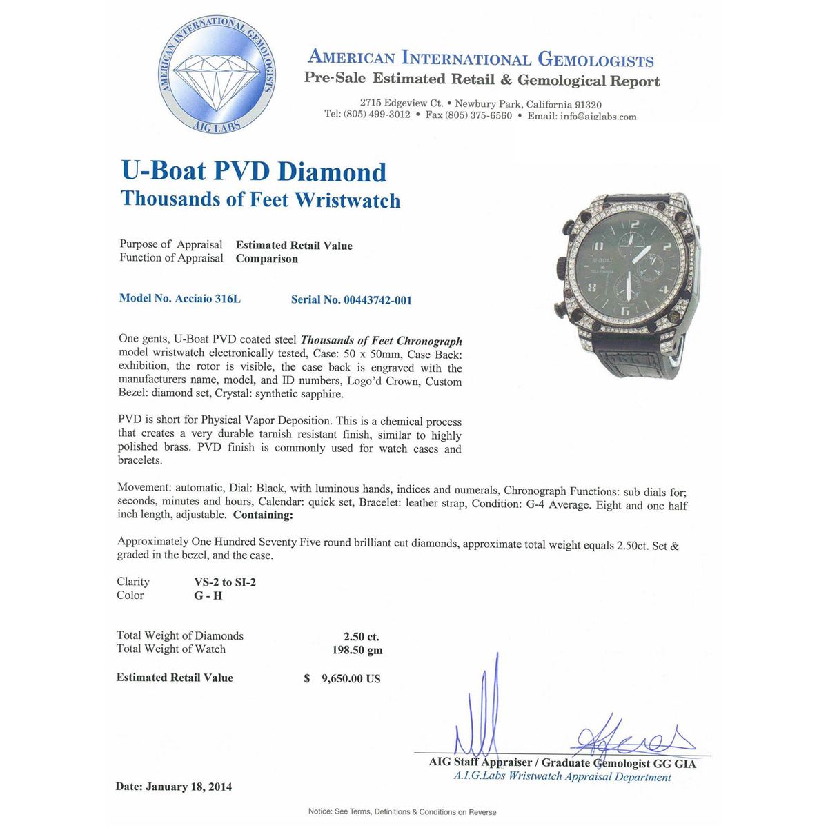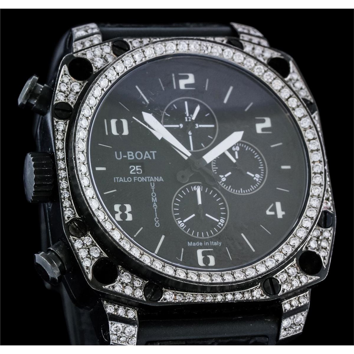 One gents, U-Boat PVD coated steel Thousands of Feet Chronograph model wristwatch electronically tested, Case: 50 x 50mm, Case Back: exhibition, the rotor is visible, the case back is engraved with the manufacturers name, model, and ID numbers, Logo'd Crown, Custom Bezel: diamond set, Crystal: synthetic sapphire. PVD is short for Physical Vapor Deposition. This is a chemical process that creates a very durable tarnish resistant finish, similar to highly polished brass. PVD finish is commonly used for watch cases and bracelets. Movement: automatic, Dial: Black, with luminous hands, indices and numerals, Chronograph Functions: sub dials for; seconds, minutes and hours, Calendar: quick set, Bracelet: leather strap, Condition: G-4 Average. Eight and one half inch length, adjustable. Containing: Approximately One Hundred Seventy Five round brilliant cut diamonds, approximate total weight equals 2.50ct. Set & graded in the bezel, and the case. Clarity VS-2 to SI-2 . Color: G - H. Total Weight of Diamonds 2.50ct. Total Weight of Watch 198.50 gm. AIG Appraised at $9,650.00.