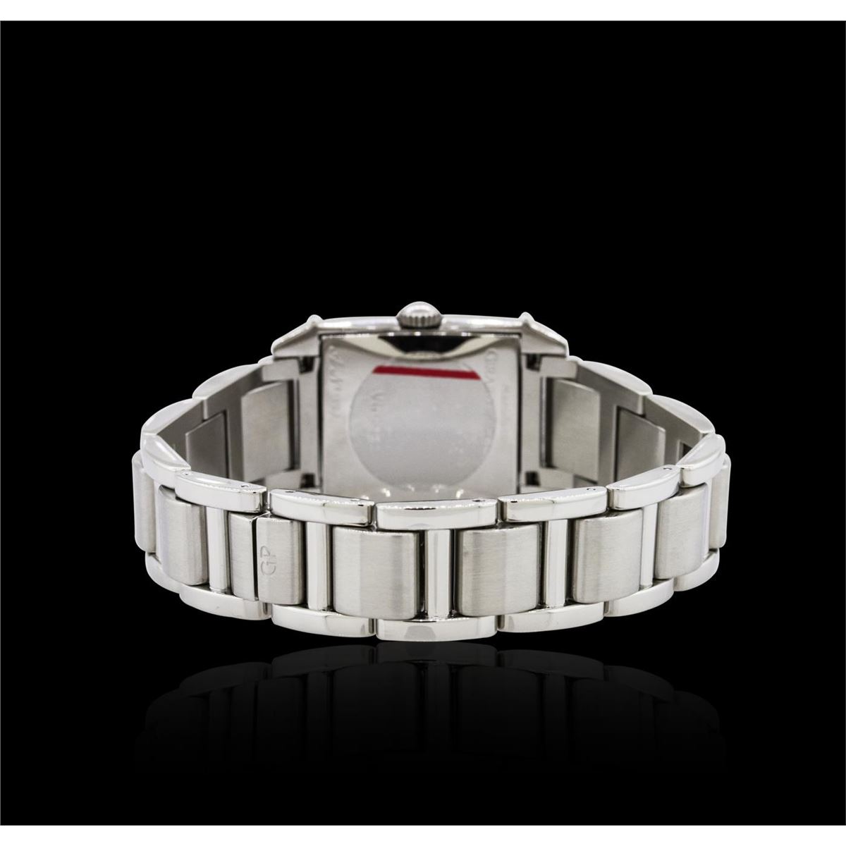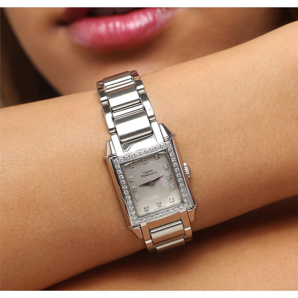 One, Girard Perregaux wristwatch electronically tested stainless steel, Case: 34 x 24mm, Case Back: engraved with the manufacturers name, information, and ID numbers, Bezel: diamond set, Crystal: synthetic sapphire lens, Movement: Swiss quartz. Dial: Silvered, with pointed hands and diamond markers. Bracelet: stainless steel link, Condition: G-5 Fine. Bright polish and satin finish. Six and three quarter inch length. Concealed deployment clasp. Containing: Forty Four round diamonds approximate total weight of 40 Stones = 0.46ct. Set & graded in the bezel. Clarity: VVS-1 to VVS-2. Color: F - G. Total Weight of Diamonds 0.46ct. Total Weight of Watch 71.93 grams. AIG Appraised at $10,300.00.