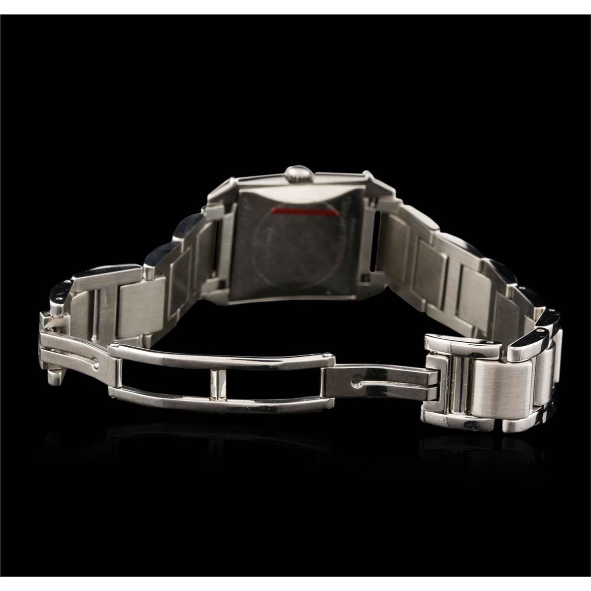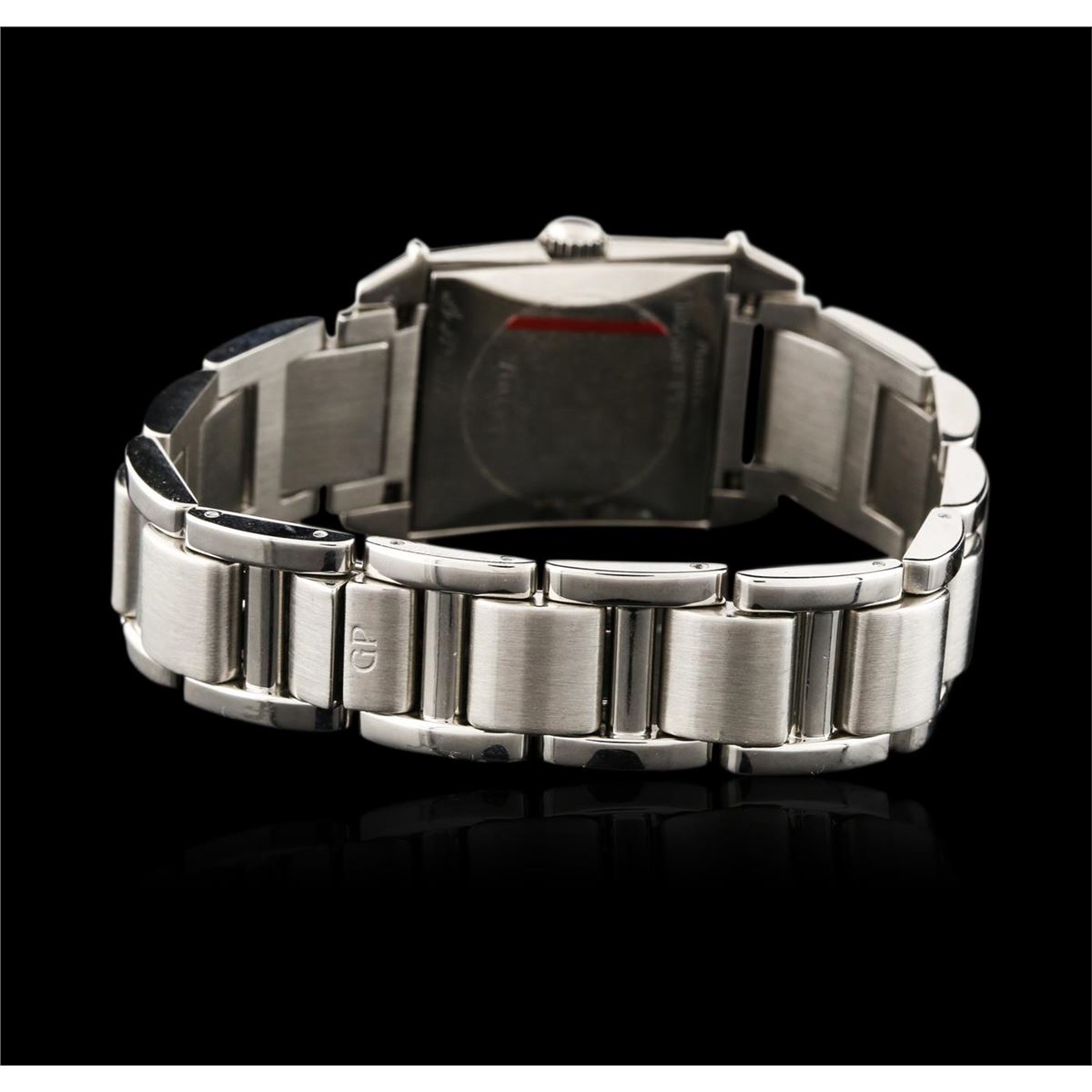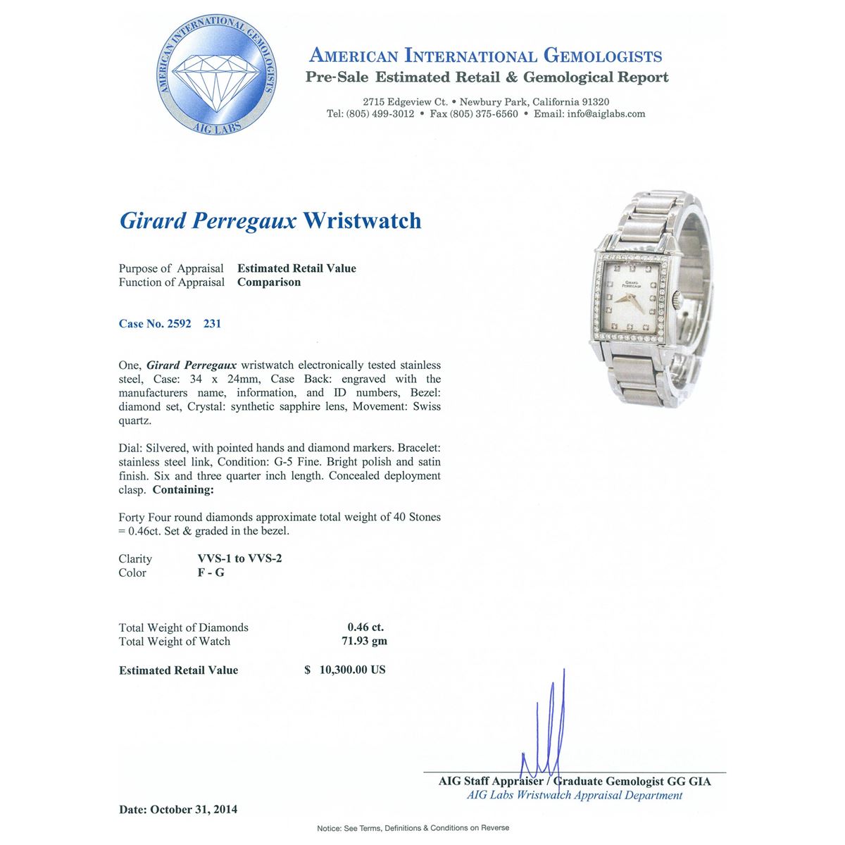 One, Girard Perregaux wristwatch electronically tested stainless steel, Case: 34 x 24mm, Case Back: engraved with the manufacturers name, information, and ID numbers, Bezel: diamond set, Crystal: synthetic sapphire lens, Movement: Swiss quartz. Dial: Silvered, with pointed hands and diamond markers. Bracelet: stainless steel link, Condition: G-5 Fine. Bright polish and satin finish. Six and three quarter inch length. Concealed deployment clasp. Containing: Forty Four round diamonds approximate total weight of 40 Stones = 0.46ct. Set & graded in the bezel. Clarity: VVS-1 to VVS-2. Color: F - G. Total Weight of Diamonds 0.46ct. Total Weight of Watch 71.93 grams. AIG Appraised at $10,300.00.