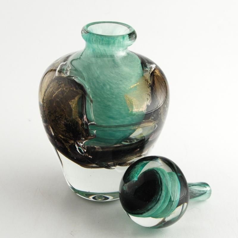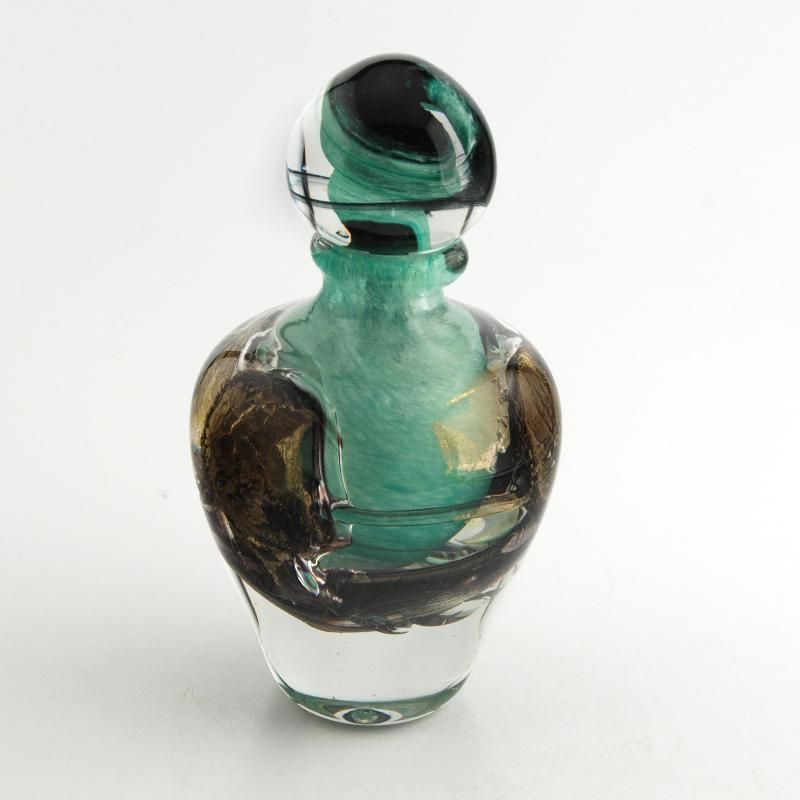 This piece is an imported original hand-blown glass bottle sculpture with gold leaf design by Jean Claude Novaro, Hand Signed by the Artist and comes with stopper! Measures approx. 4" (diameter) x 8" (height), 5 lbs. (weight).