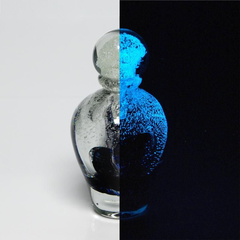 This piece is an imported original hand-blown glow-in-the-dark glass bottle sculpture by Jean Claude Novaro, Hand Signed by the Artist and comes with stopper! Measures approx. 4.5" (diameter) x 8.5" (height), 6 lbs. (weight).