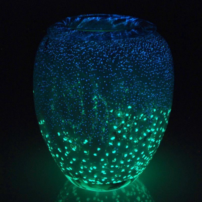 This piece is an imported original hand-blown glow-in-the-dark glass vase sculpture by Jean Claude Novaro, Hand Signed by the Artist! Measures approx. 5" (diameter) x 6.5" (height), 3.5 lbs. (weight).