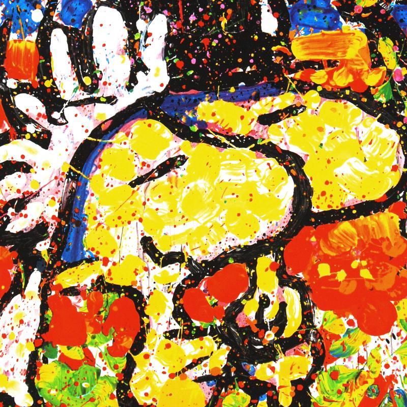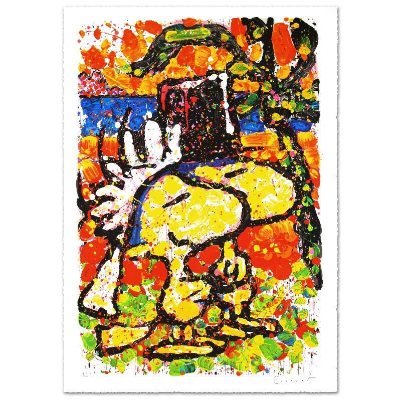 Master Artist Tom Everhart is the protege of famed "Peanuts" creator, Charles M. Schulz (1922â€"2000). As the only artist in the world granted the rights to draw the "Peanuts" characters in his own work, Everhart creates vibrant, extremely collectible rainbow masterpieces featuring Snoopy, Woodstock and the gang. "Hitched" is a limited edition hand pulled original lithograph on museum quality deckle-edge paper, numbered and hand signed by Everhart! Measures approx. 31" x 44" (with border), 26" x 39" (image). This artwork was created on one of two rare antique Marinoni Voirin lithograph presses that date back to the 1800's, and are reputed to come from the Paris print shop used by Henri Toulouse-Lautrec. There are only 7 of these magnificent beasts left in the world: the smaller one (with a print bed size of 25" x 35"), weighs 9 tons, and the larger one weighs in at 11 tons (print bed size 31" x 47"). The significance of this is that the lithographs produced by this method are of the finest quality, using techniques that are so labor and time intensive that very few master printers know how to operate and care for these presses today. Each lithograph is created with hand-mixed colors applied one at a time - a highly trained and synchronized team must hand feed each museum-quality sheet of paper through the press numerous times in order to set the colors and impressions, while the Chromist - a trained color specialist - adjusts each color by look and feel to match the original artwork, as if mixing a potion. The result is an image with maximum pigment saturation, formed through rich layers of color that imbue the artwork with a permanency of brilliance - proven over centuries to last. In contrast, today's printers use a method more akin to a dot matrix style application, with the colors all premixed and sprayed onto a sheet in a uniform layer, resulting in a much less saturated image that is susceptible to fading and imperfect color reproduction. This is one of the final Tom Everhart editions to be printed using this very special technique.