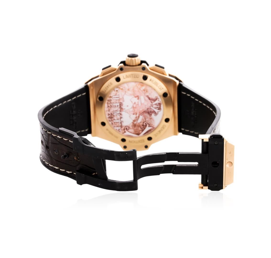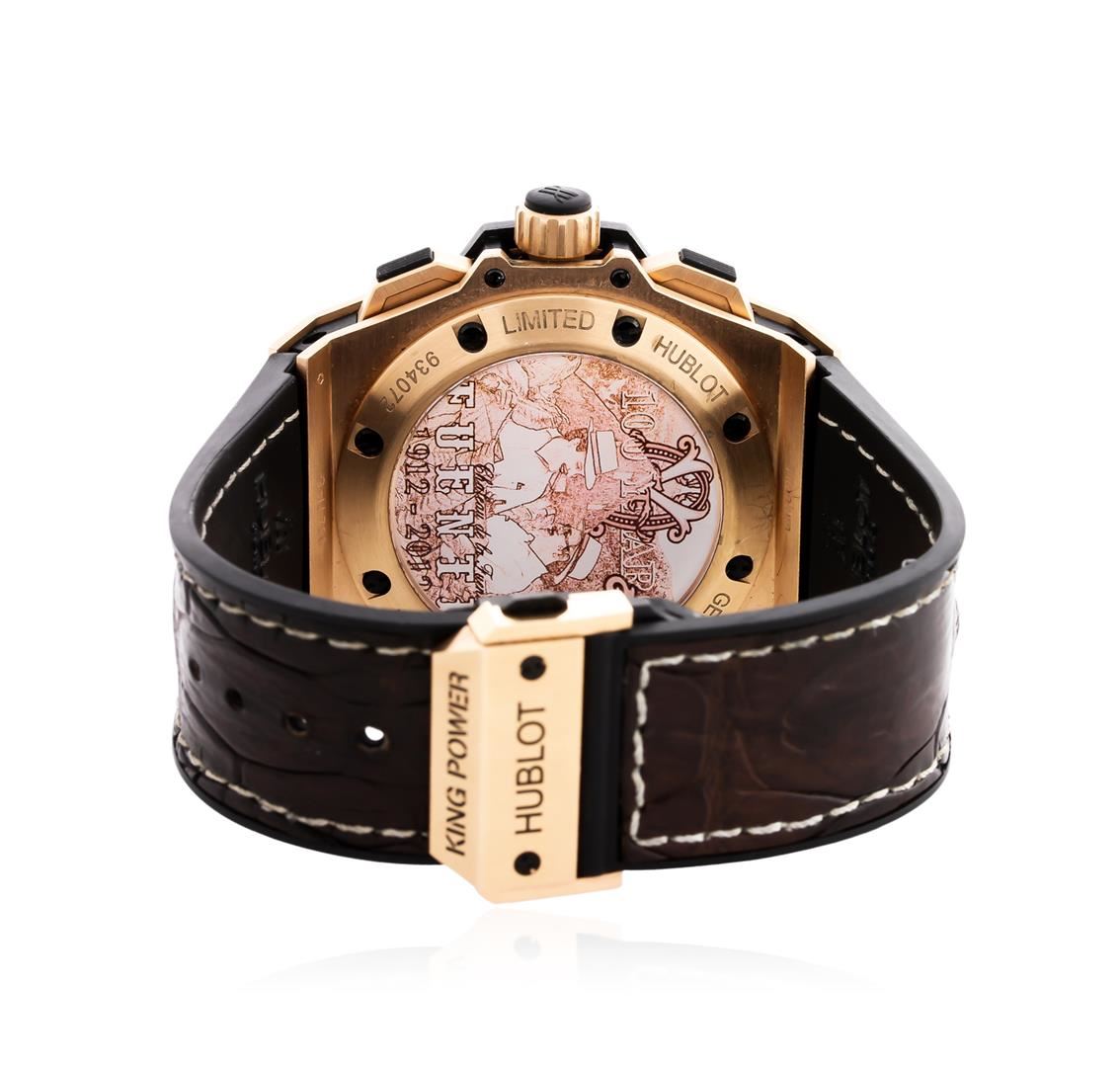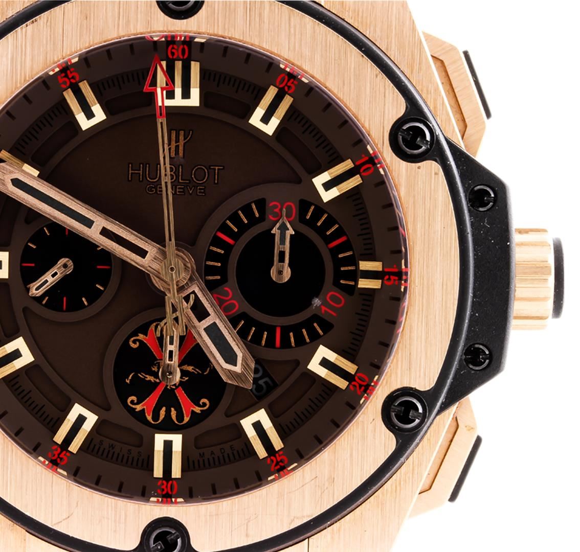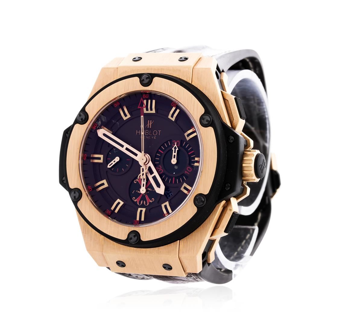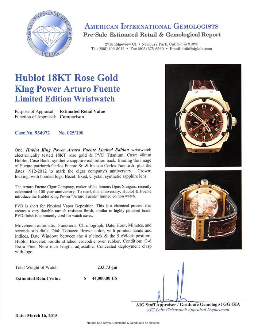 One, Hublot King Power Arturo Fuente Limited Edition wristwatch electronically tested 18KT rose gold & PVD Titanium, Case: 48mm Hublot, Case Back: synthetic sapphire exhibition back, framing the image of Fuente patriarch Carlos Fuente Sr. & his son Carlos Fuente Jr. plus the dates 1912-2012 to mark the cigar company's anniversary. Crown: locking, with hooded lugs, Bezel: fixed, Crystal: synthetic sapphire lens, The Arturo Fuente Cigar Company, maker of the famous Opus X cigars, recently celebrated its 100 year anniversary. To mark this anniversary, Hublot & Fuente introduce the Hublot King Power "Arturo Fuente" limited edition watch. PVD is short for Physical Vapor Deposition. This is a chemical process that creates a very durable tarnish resistant finish, similar to highly polished brass. PVD finish is commonly used for watch cases. Movement: automatic, Functions: Chronograph; Date, Hour, Minutes, and seconds sub dials, Dial: Tobacco Brown color, with pointed hands and indices, Date Window: between the 4 o'clock & the 5 o'clock position, Hublot Bracelet: saddle stitched crocodile over rubber, Condition: G-6 Extra Fine. Nine inch length, adjustable. Concealed deployment clasp with logo. Total Weight of Watch233.73 grams. AIG Appraised at $44,000.00.