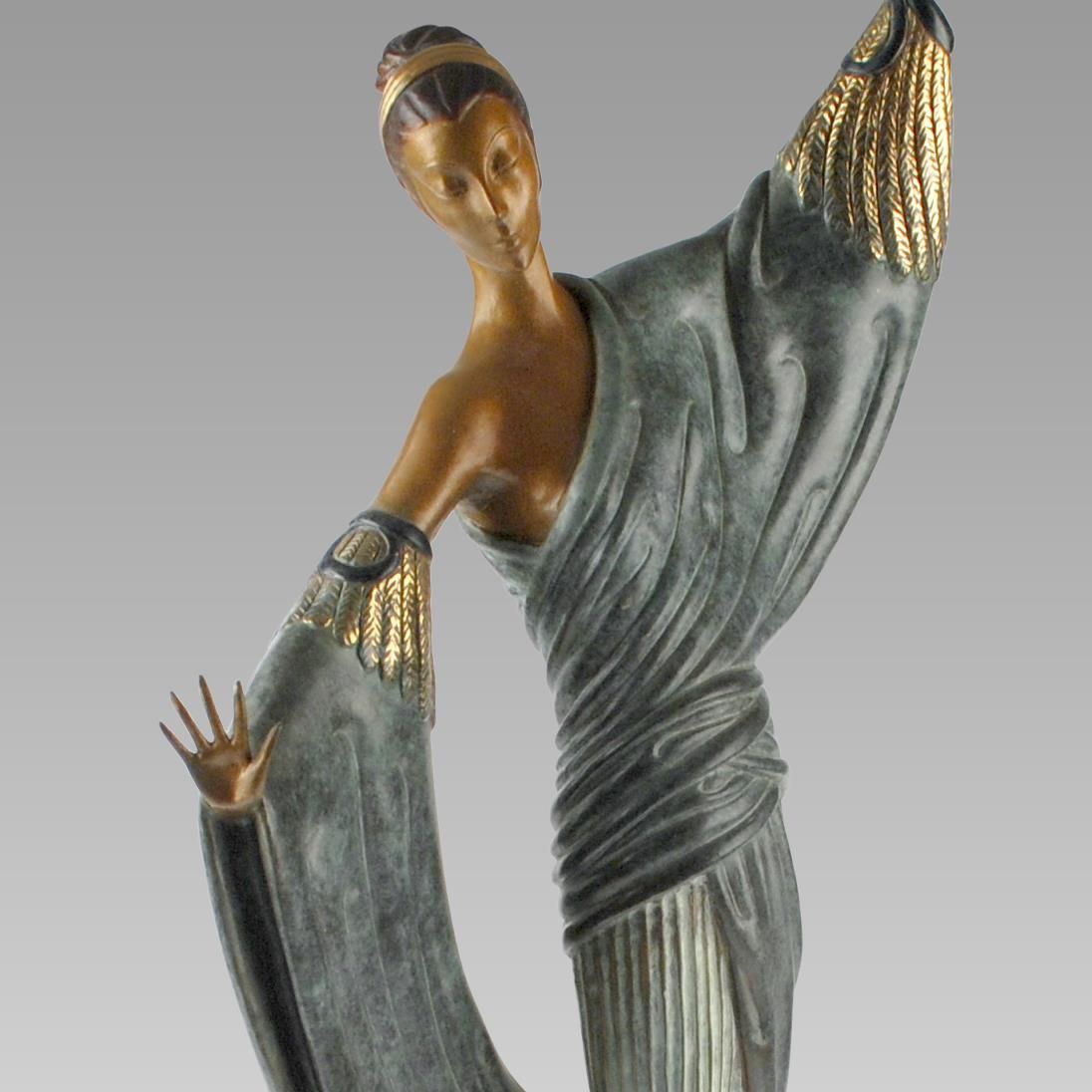 Known as "The Father of Art Deco," Erte (1892-1990) and his immense talent have been recognized by art collectors through the ages. His clean lines and intricate designs are awe-inspiring. "In The Evening" is a limited edition bronze sculpture, numbered 170 out of 300 and cast signed by Erte (1892-1990). Measures approx. 10" (width) x 6" (depth) x 20.5" (height); 14 lbs. (weight).