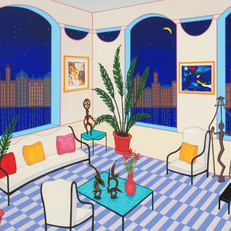 "Interior with Primitive Art" is a limited edition serigraph on paper, numbered and hand signed by Fanch Ledan. Measures approx. 22.5" x 18.5" (with border), 20" x 16" (image).