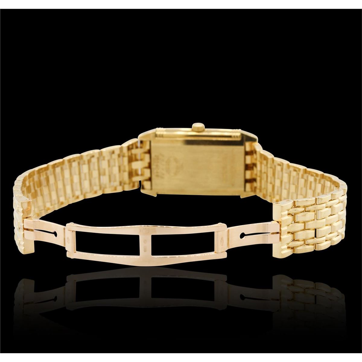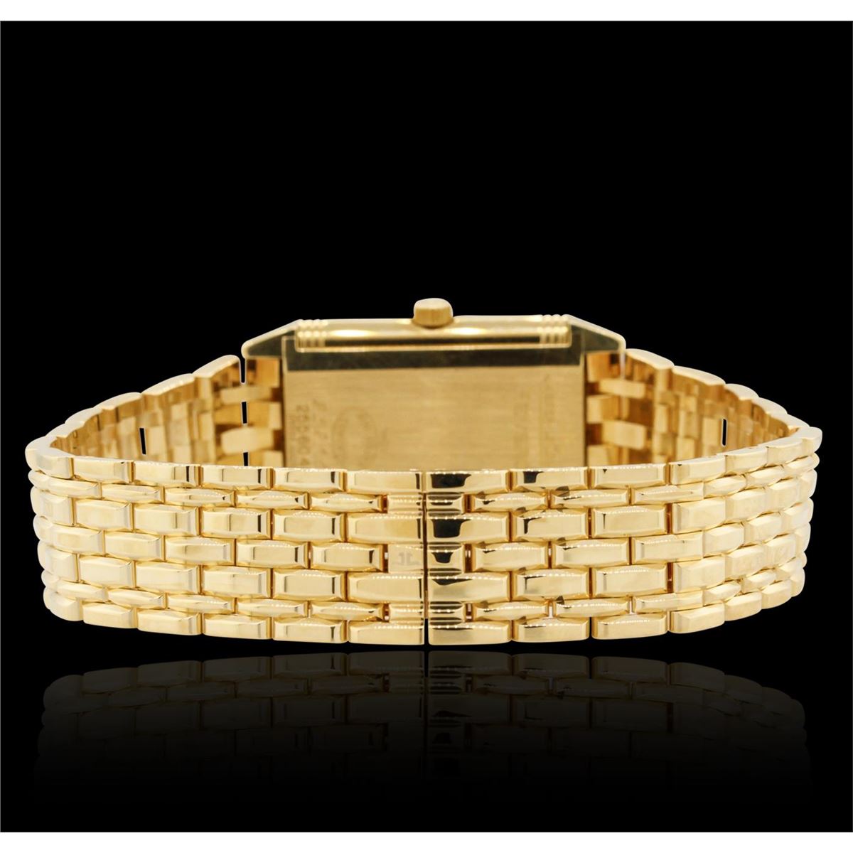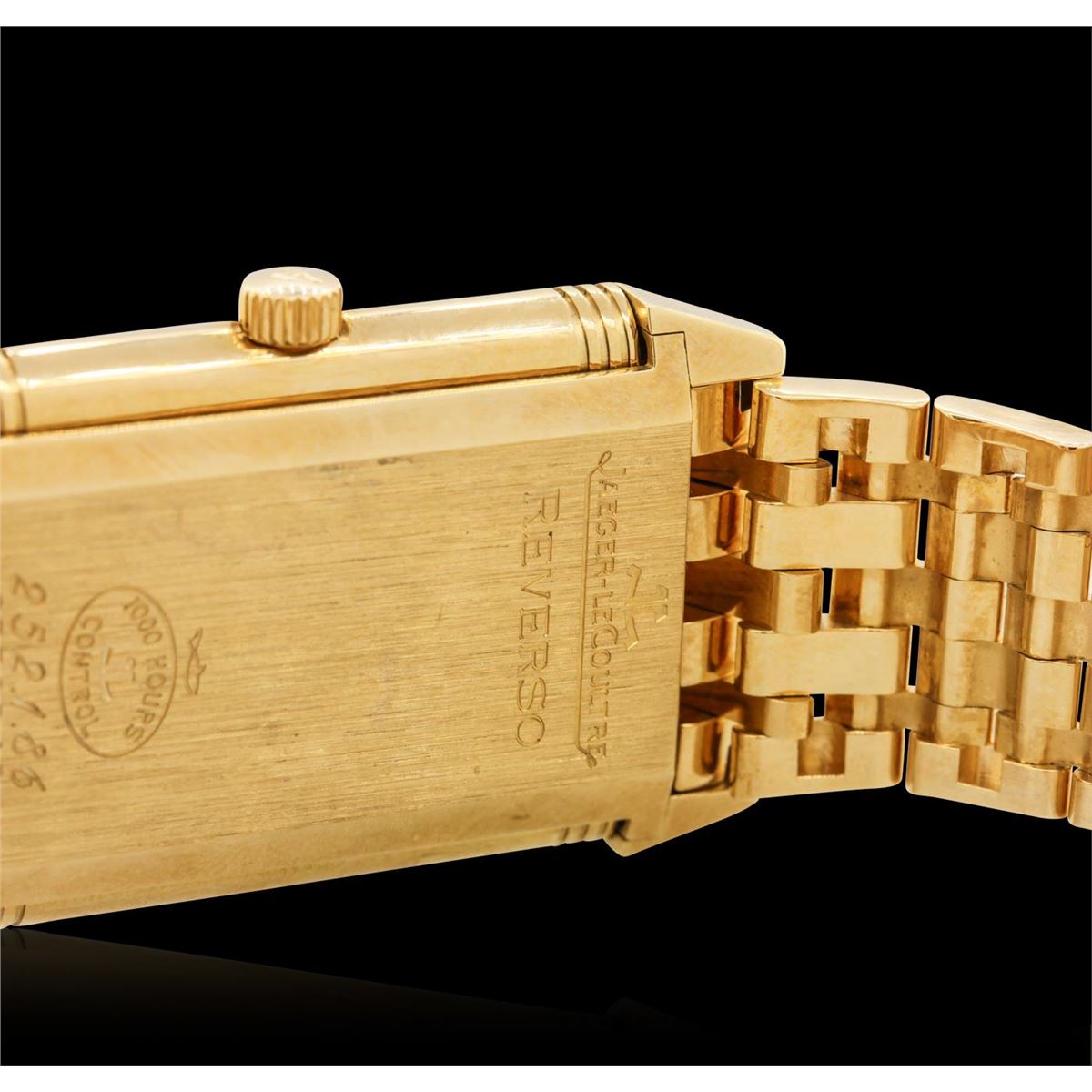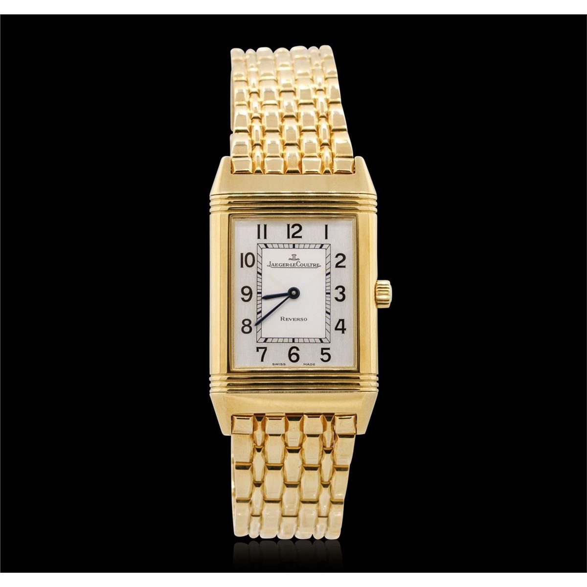 One Jaeger le Coultre Reverso wristwatch featuring: 18KT Yellow Gold Bracelet with deployment clasp, bezel, case, crown, and lugs, white dial with analog display, Arabic numerals, black hour and minute hands. Swiss made. Includes papers. Case measures 25mm including crown.