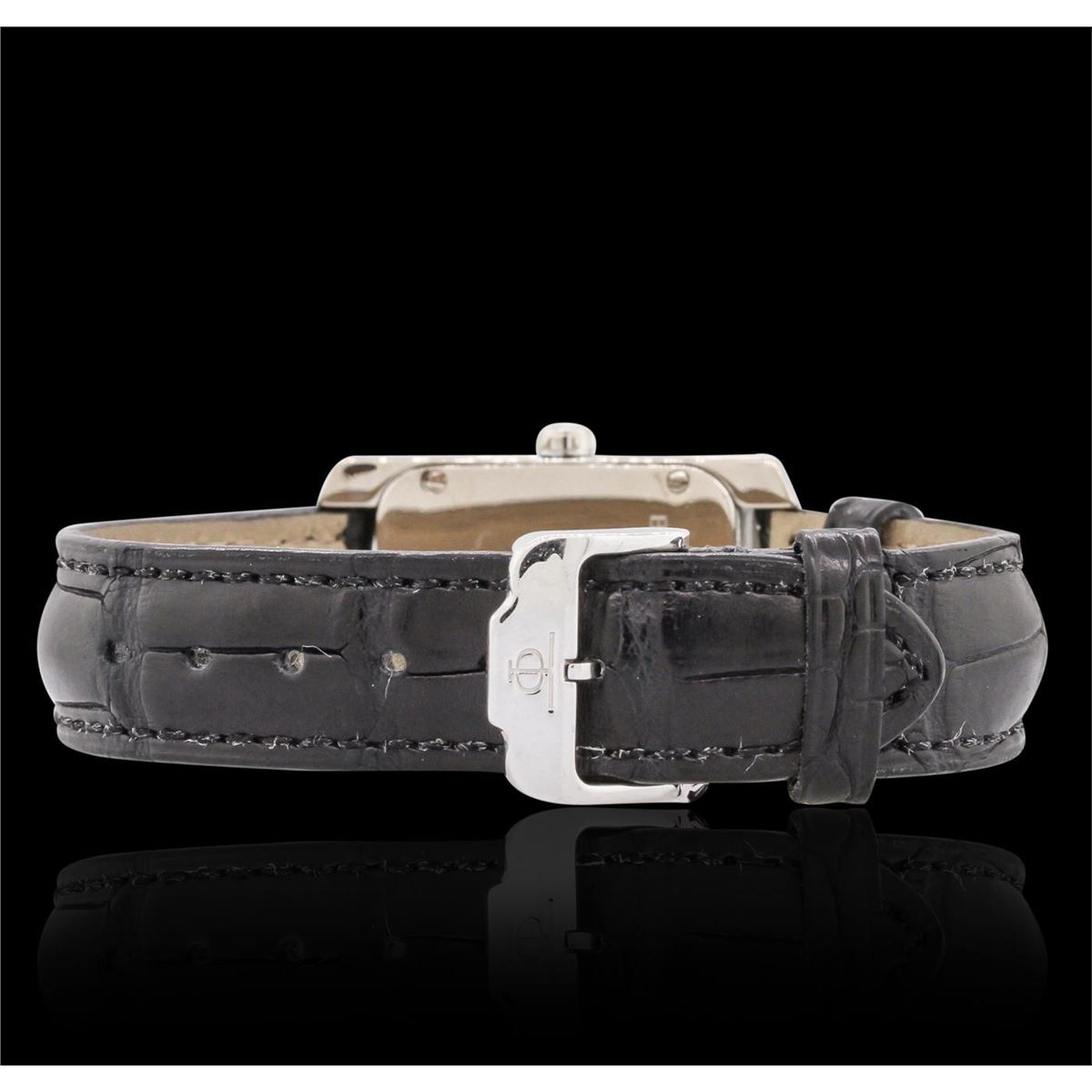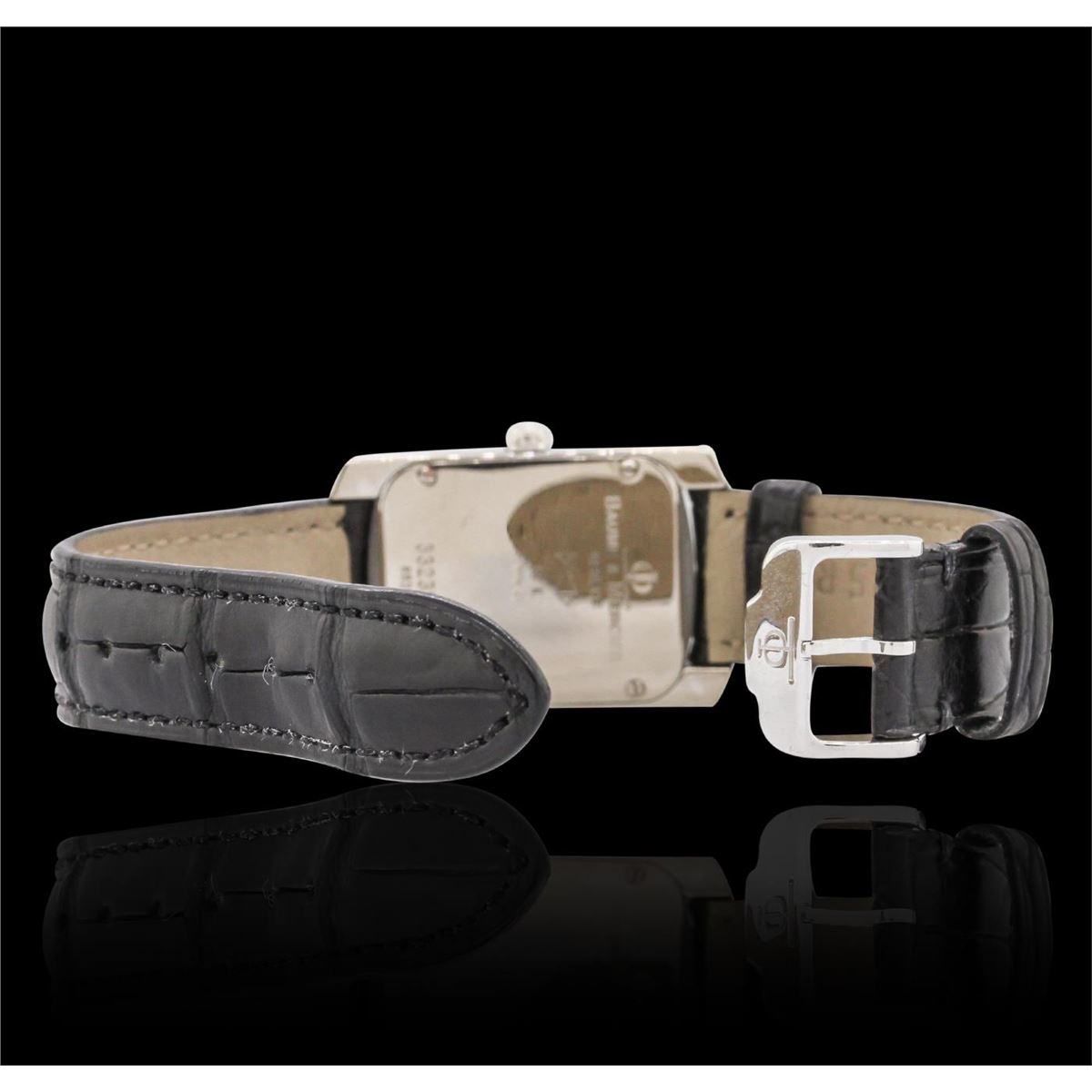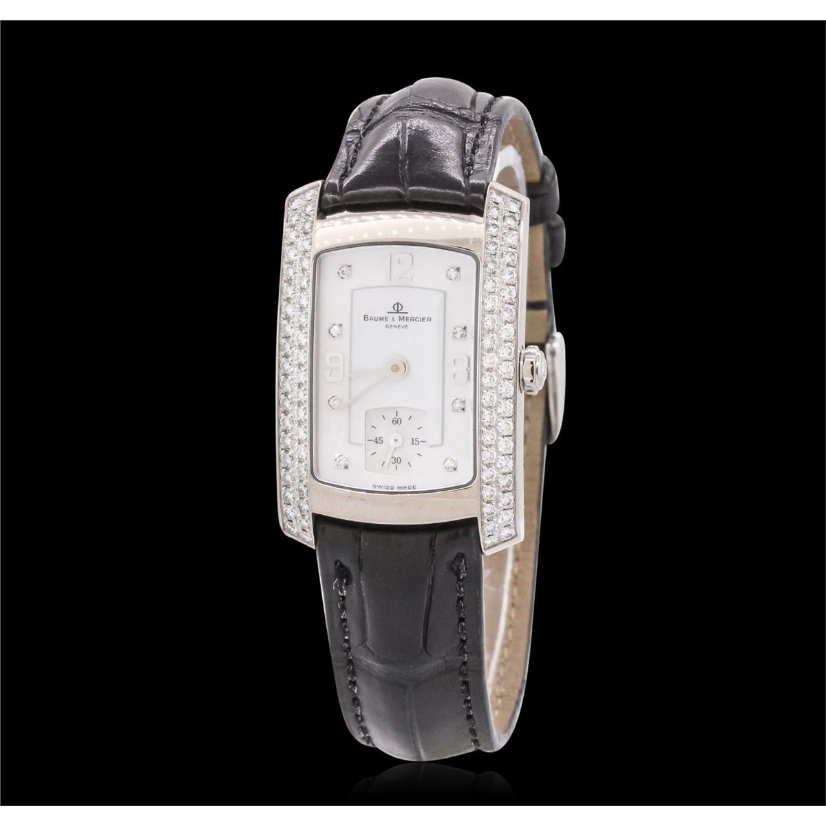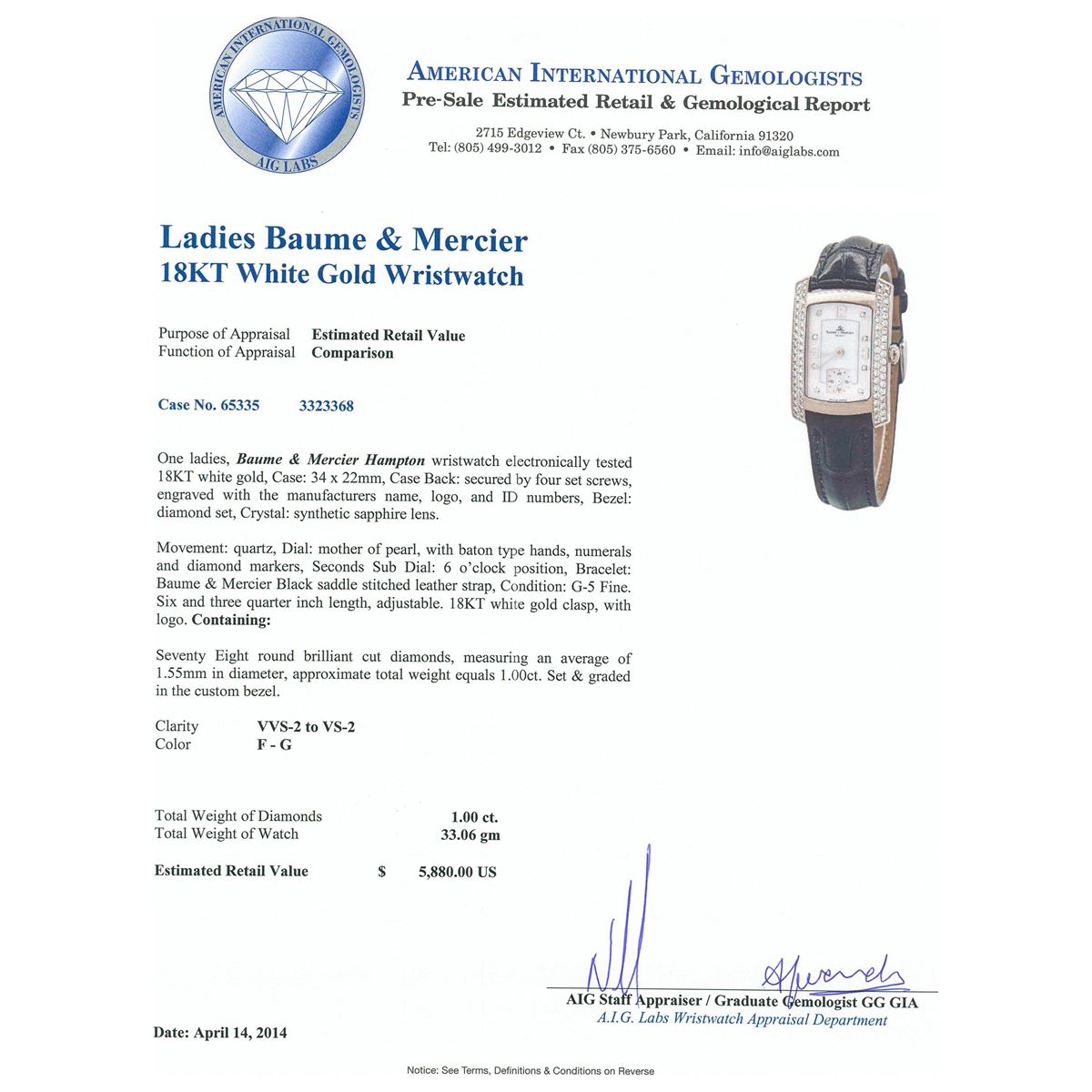 One ladies, Baume & Mercier Hampton wristwatch electronically tested 18KT white gold, Case: 34 x 22mm, Case Back: secured by four set screws, engraved with the manufacturers name, logo, and ID numbers, Bezel: diamond set, Crystal: synthetic sapphire lens. Movement: quartz, Dial: mother of pearl, with baton type hands, numerals and diamond markers, Seconds Sub Dial: 6 o'clock position, Bracelet: Baume & Mercier Black saddle stitched leather strap, Condition: G-5 Fine. Six and three quarter inch length, adjustable. 18KT white gold clasp, with logo. Containing: Seventy Eight round brilliant cut diamonds, measuring an average of 1.55mm in diameter, approximate total weight equals 1.00ct. Set & graded in the custom bezel. Clarity VVS-2 to VS-2. Color: F - G. Total Weight of Diamonds 1.00ct. Total Weight of Watch 33.06gm. AIG Appraised at $5,880.00.