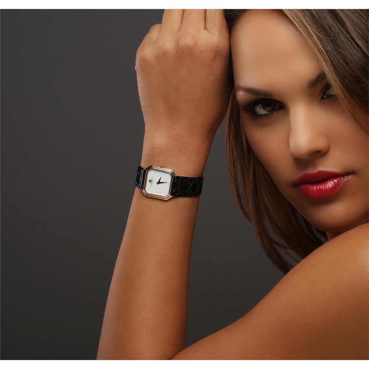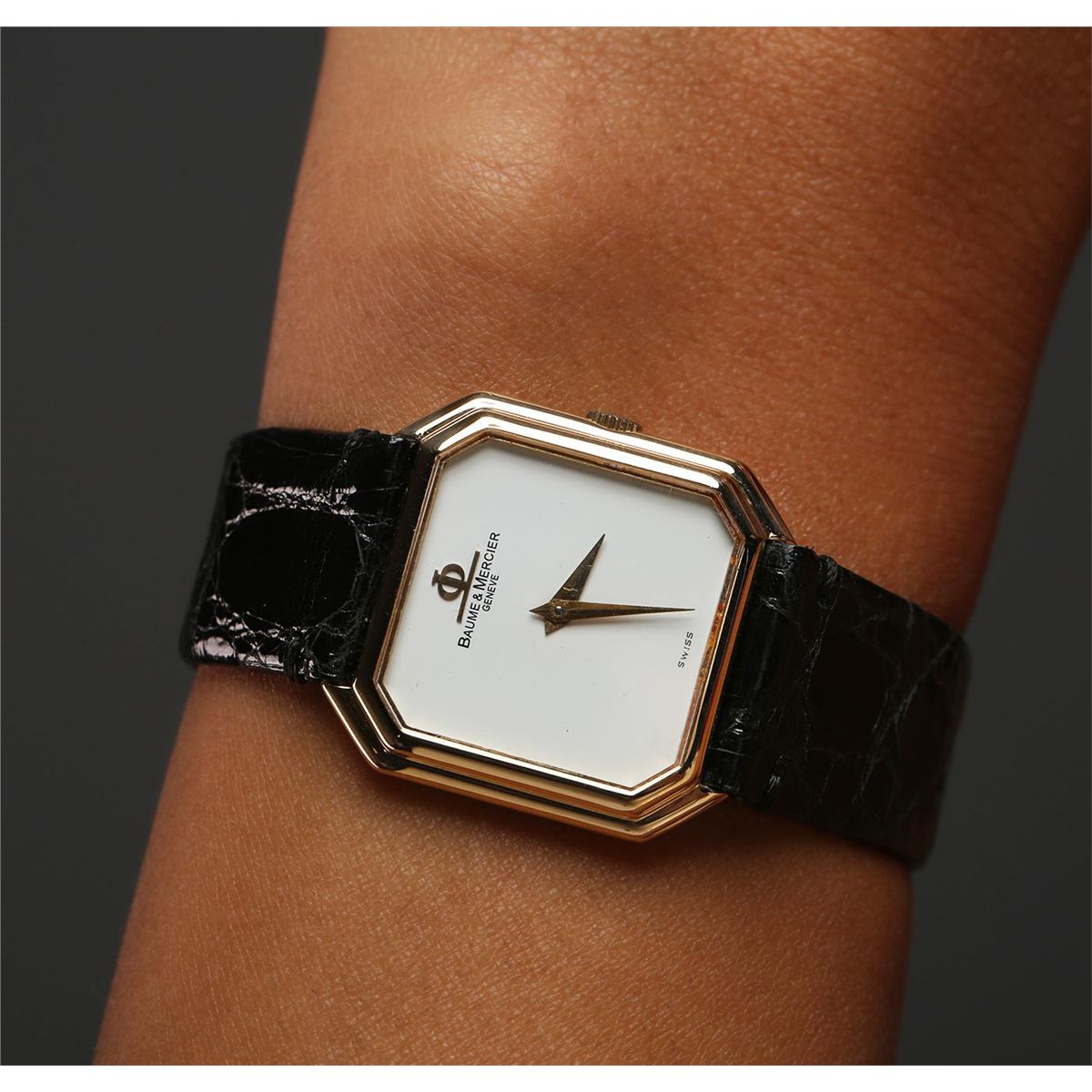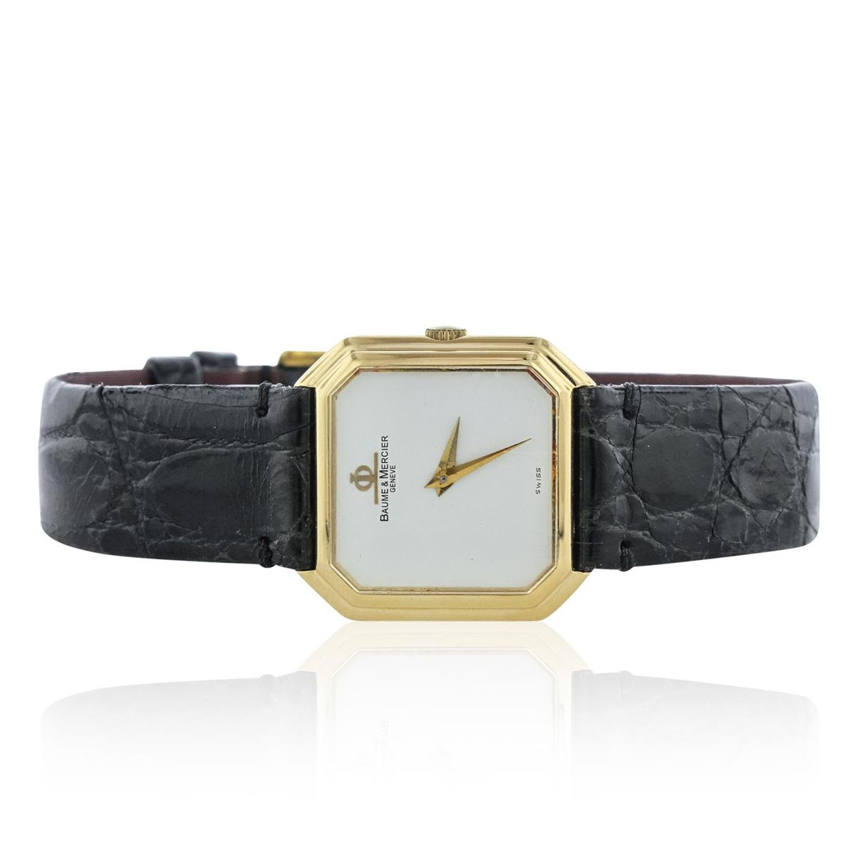 One Baume & Mercier wristwatch featuring: black leather band, 18KT yellow gold buckle, 18KT yellow gold case, lugs, and crown, white dial with analog display, yellow gold minute and hour hands, Baum & Mercier logo at 12 o'clock position, Swiss marking at 6 o'clock position.