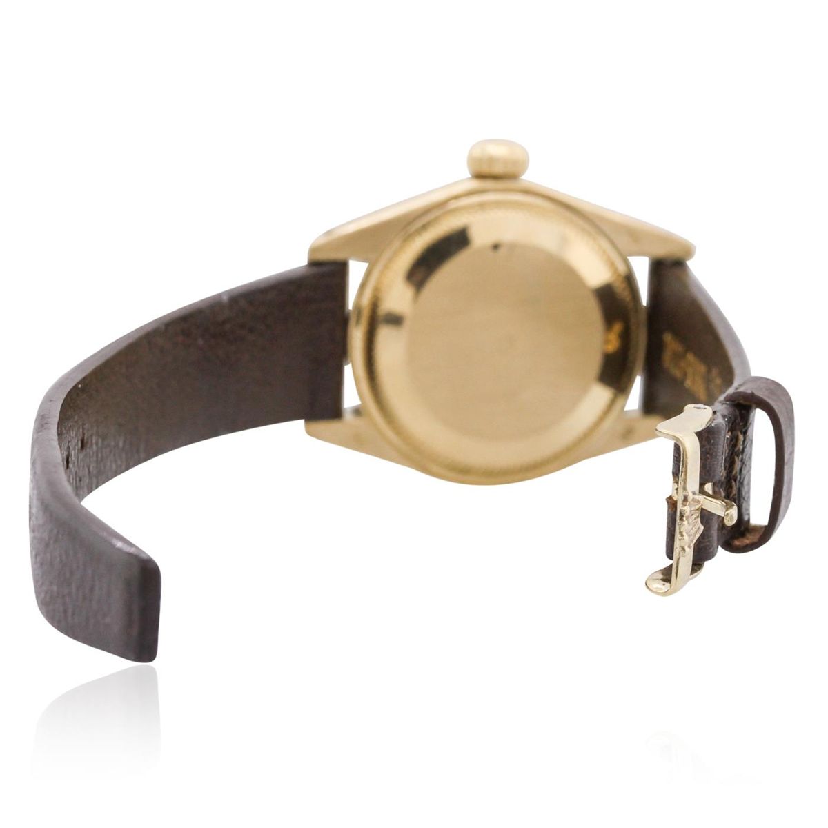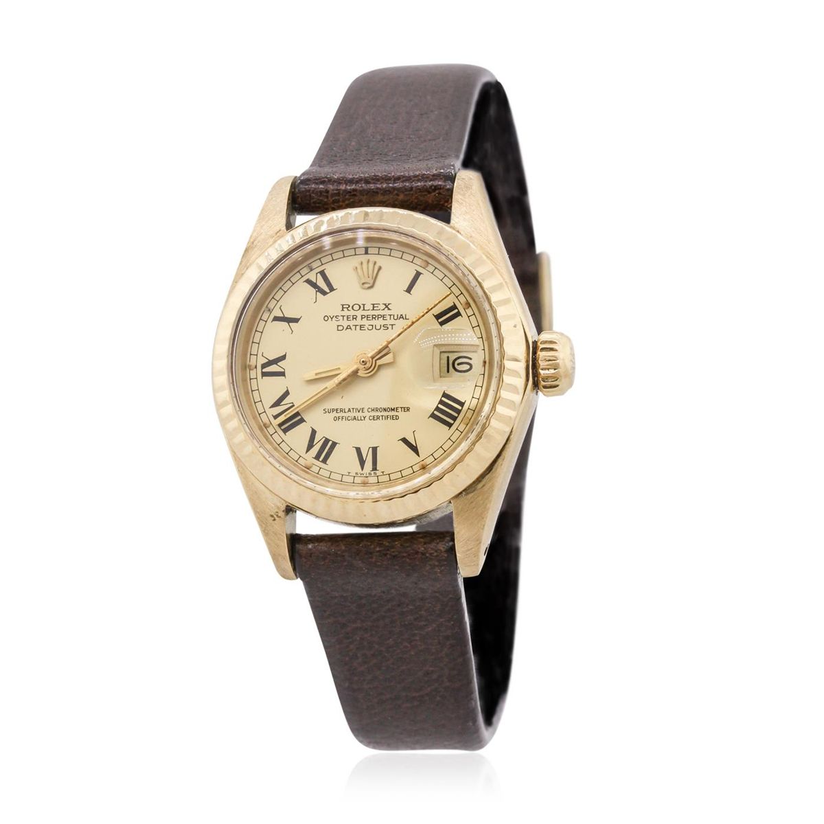 One ladies, hand crafted & machine milled Rolex DateJust model wristwatch electronically tested 18KT yellow gold, Case: 26mm oyster, Crown: twinlock with logo, Bezel: fluted, Crystal: acrylic cyclops lens, Circa: 1978. Movement: superlative chronometer, Dial: Champagne, baton hands, and Roman numerals, Date Window: 3 o'clock position, non-quick set, Bracelet: leather strap, Condition: G-4 Average. Bright polish finish. Six and one half inch length, adjustable. Total Weight of Watch 32.67gm. AIG Appraised at $6,880.00.