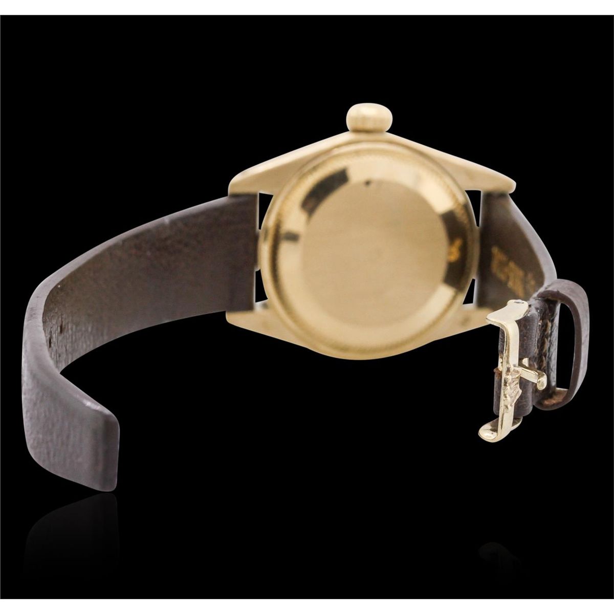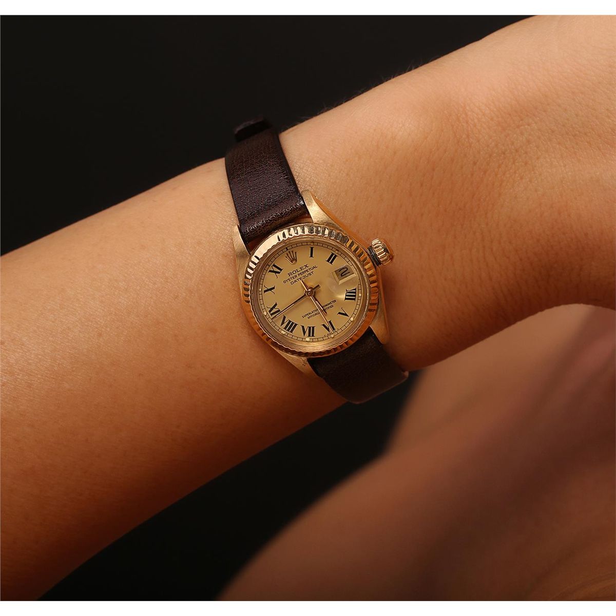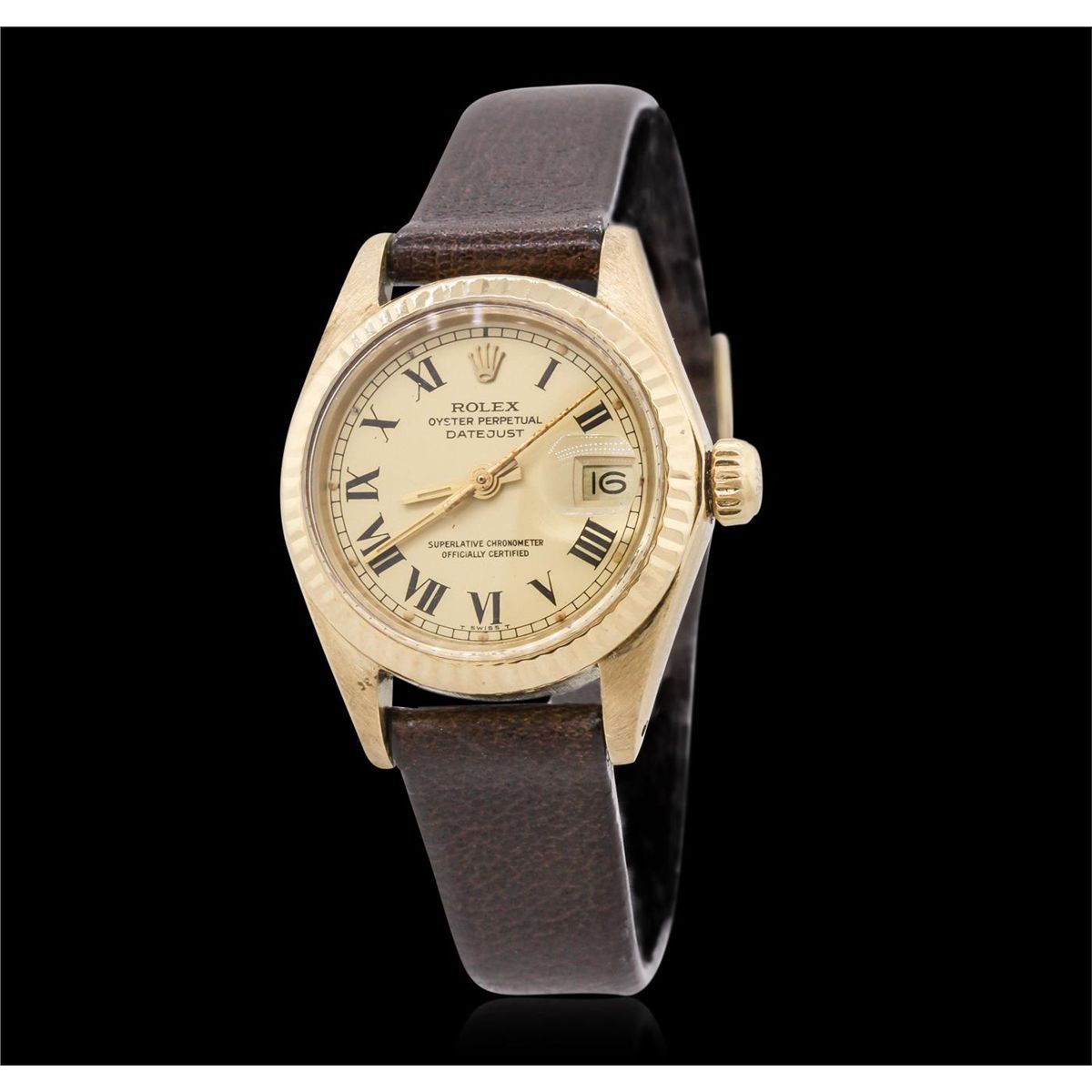 One ladies, hand crafted & machine milled Rolex DateJust model wristwatch electronically tested 18KT yellow gold, Case: 26mm oyster, Crown: twinlock with logo, Bezel: fluted, Crystal: acrylic cyclops lens, Circa: 1978. Movement: superlative chronometer, Dial: Champagne, baton hands, and Roman numerals, Date Window: 3 o'clock position, non-quick set, Bracelet: leather strap, Condition: G-4 Average. Bright polish finish. Six and one half inch length, adjustable. Total Weight of Watch 32.67gm. AIG Appraised at $6,880.00.